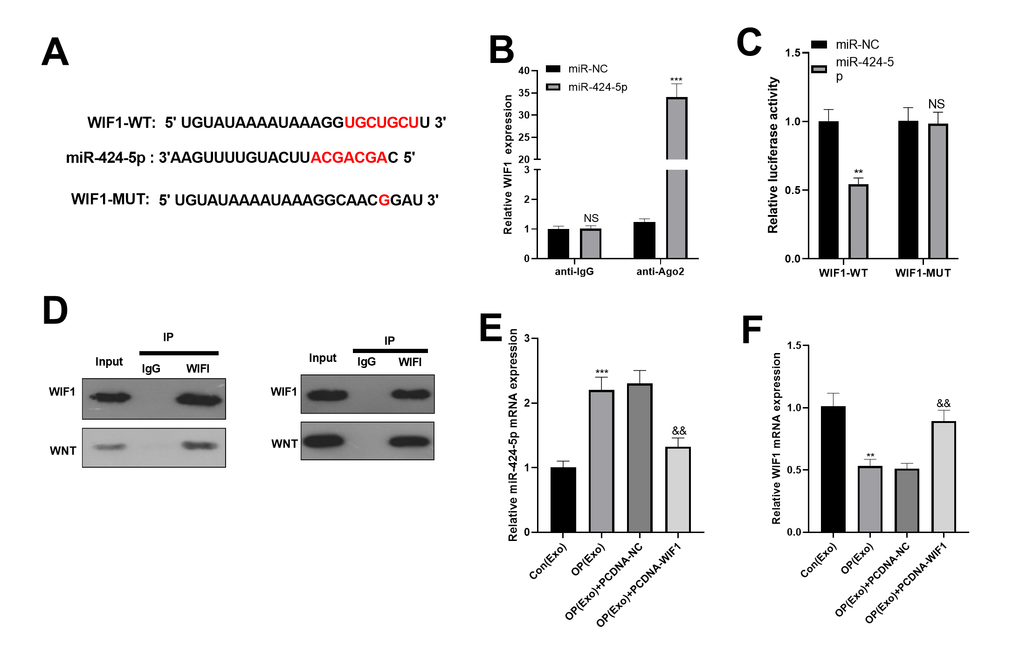 We adopted the online websites to search the target genes of miR-424-5p. Interestingly, StarBase (https://web.archive.org/web/20110222111721/http://starbase.sysu.edu.cn/) proved that WIF1 was a target of miR-424-5p (Figure 4A). In addition, dual-luciferase reporter assay proved that miR-424-5p bound to the wild-type WIF1 (Figure 4B). Hence, we conducted RIP to further clarify the relationship between WIF1 and miR-424-5p. As a result, after BMSCs were transfected with miR-424-5p, the amount of WIF1 precipitated in the Ago2 antibody group was far more than that in the IgG group, suggesting that WIF1 bound to Ago2 through miR-424-5p (Figure 4C). Subsequently, immunoprecipitation showed that WIF1 bound to WNT, and WIF1 was expressed in WNT, while not in IgG (Figure 4D). Finally, we transfected WIF1 overexpressed plasmids in BMSCs-derived exosomes. The result manifested that after transfection of WIF1 overexpressed plasmids, the miR-424-5p mRNA was down-regulated, while the WIF1 mRNA was up-regulated (Figure 4E, 4F). The above findings illustrated that miR-424-5p targeted WIF1 and was negatively correlated with it.