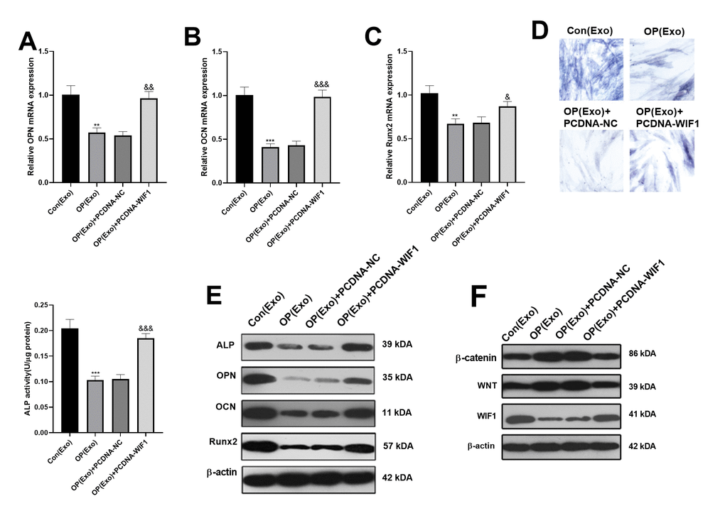 BMSCs were divided into 4 groups based on different treatment methods, namely Con(Exo), OP(Exo), OP(Exo)+PCDNA-NC and OP(Exo)+PCDNA-WIF1. Interestingly, the mRNA levels of OPN, OCN and Runx2 in the OP(Exo) group were distinctly lower than that in the Con(Exo) group. Beside, the mRNA expression of OPN, OCN and Runx2 in the OP(Exo)+PCDNA-WIF1 group was increased compared with the OP(Exo)+PCDNA-NC group. However, mRNA levels of these genes did not change significantly compared with the Con(Exo) group (Figure 5A–5C). Similar results were obtained by ALP activity detection (Figure 5D). Also, western blot was implemented to compare the protein expression of OPN, OCN and Runx2, and the results were consistent with the gene expression trend (Figure 5E). Furthermore, western blot was used to monitor the expression of WIF1/Wnt/β-catenin. Interestingly, compared with the Con(Exo) group, WIF1 was down-regulated, while Wnt and β-catenin were up-regulated in the OP(Exo) group, and results were reversed after transfection of WIF1 overexpressed plasmid (Figure 5F). The above results suggested that WIF1 overexpression exosomes partially reversed the osteogenic effect of BMSCs-derived exosomes in osteoporosis patients.