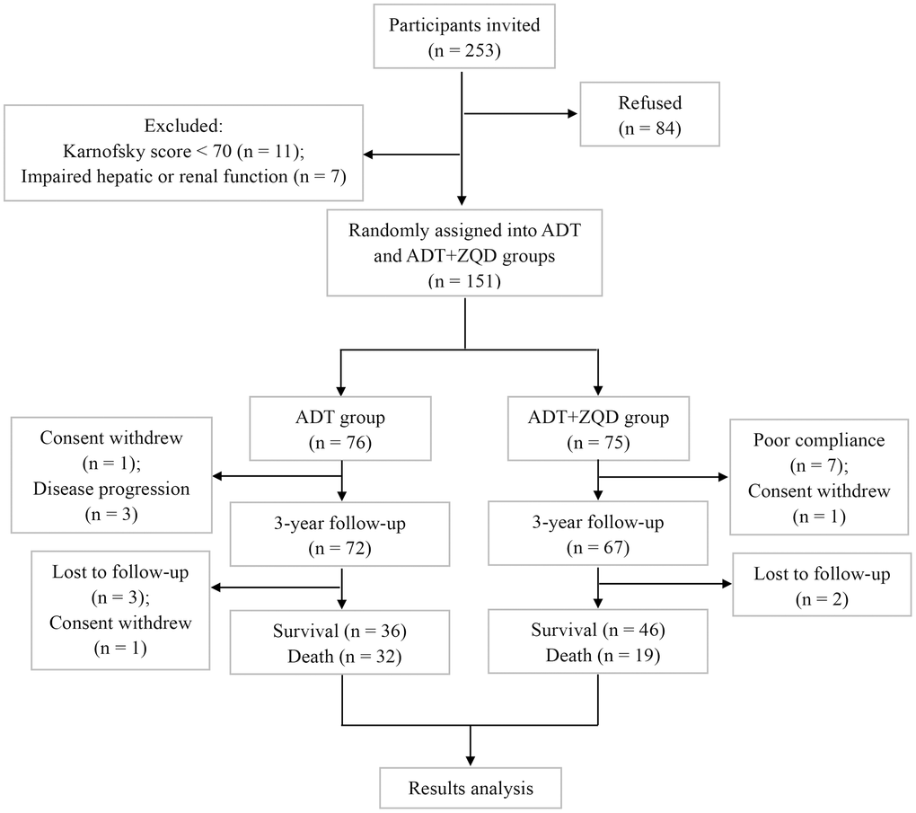 The flowchart of study participants is shown in Figure 1. We recruited 253 patients, among which 11 were excluded due to low Karnofsky scores (<70) and 7 were excluded because of impaired hepatic or renal functions. Eighty-four patients refused to participate in the study. 151 patients were randomly assigned to ADT group (n=76) or ADT+ZQD group (n=75). The treatment lasted for three years and the survival rate of patients was assessed. Among the patients for analysis (n=68 for ADT and n=65 for ADT+ZQD), the mean ages were 66 for ADT group and 65 for ADT+ZQD (p=0.508). All patients in the two groups had a mean Karnofsky score of 100 (p=0.914). The numbers of patients with a Gleason score of less than 7 were 35 and 32 in ADT and ADT+ZQD groups, respectively (p=0.796). PSA levels were 37.6 and 42.8 ng/mL for ADT and ADT+ZQD groups, respectively (p=0.699). The TNM stages and EORTC QLQ-C30 life quality scores were also comparable between the two groups (Table 1).