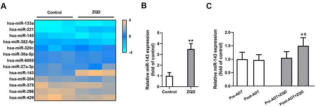 To clarify the mechanism of action of ZQD, we incubated DU145 cells with 50 mg/mL ZQD and analyzed the expression levels of an array of miRNAs before and after treatment using a microarray assay (Figure 3A). Among the miRNAs investigated, only miR-143 demonstrated prominent upregulation after ZQD treatment. We then proceeded to confirm the upregulation of miR-143 in DU145 cells using qRT-PCR analysis and found that ZQD treatment led to an over three-fold increase in miR-143 expression in vitro (p<0.01, Figure 3B). It is worth noting that we did not perform ADT treatment on DU145 cells because DU145 is an androgen-independent cell line which would not respond to ADT therapy [6]. In patient serum samples, miR-143 upregulation was also observed in patient who received ADT+ZQD treatment (p<0.01), while ADT treatment alone did not result in such upregulation (Figure 3C).
