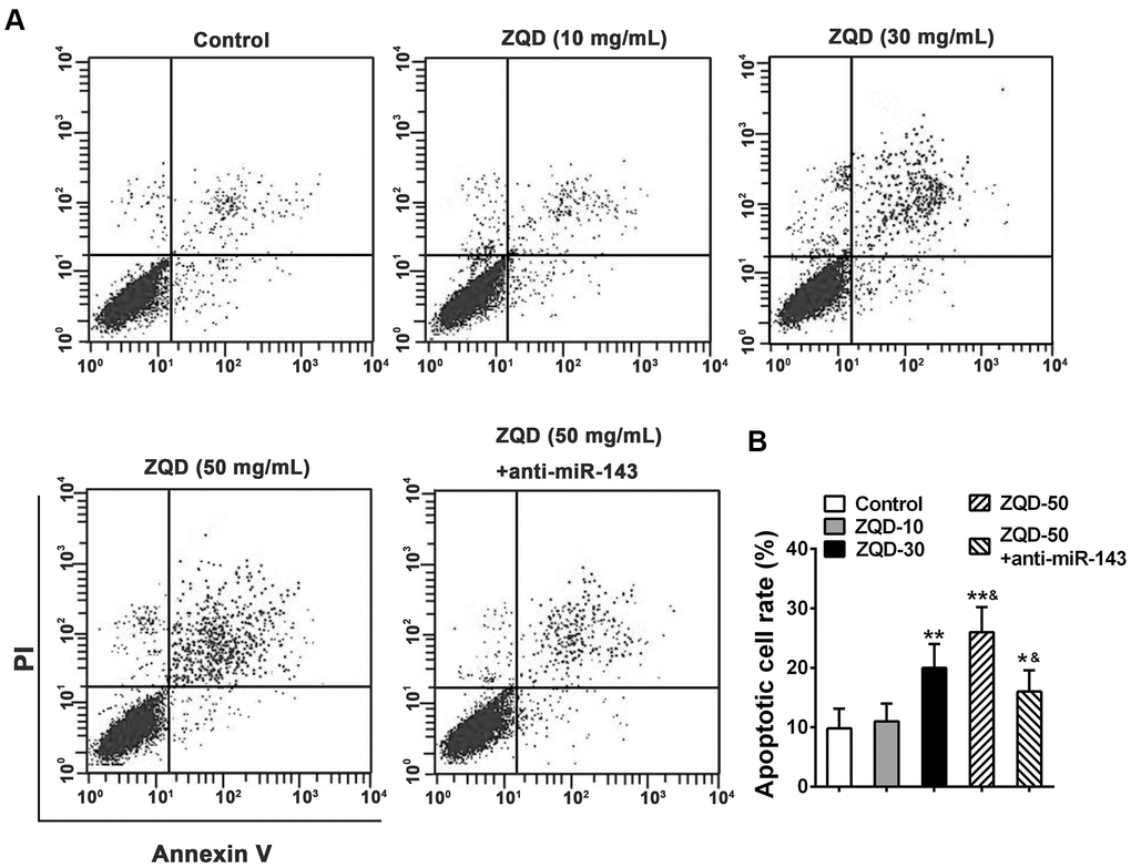 We then tested the efficacy of ZQD in inducing cell apoptosis using a flow cytometry analysis. As shown in Figure 4, we observed that treatment with ZQD of increasing concentrations (10-50 mg/mL) resulted in a dose-dependent increase in cell apoptosis (Figure 4A), and at the dose of 30 and 50 mg/mL, the increase in apoptosis was significant (p<0.01 for 30 mg/mL and p<0.001 for 50 mg/mL) (Figure 4B). Treatment with anti-miR-143 and 50 mg/mL ZQD, in contrast, demonstrated attenuated cell apoptosis rates (p<0.01, compared to treatment with 50 mg/mL ZQD alone). This data suggested that ZQD promoted cell apoptosis but downregulating miR-143 could at least partially attenuate this effect (Figure 4B).