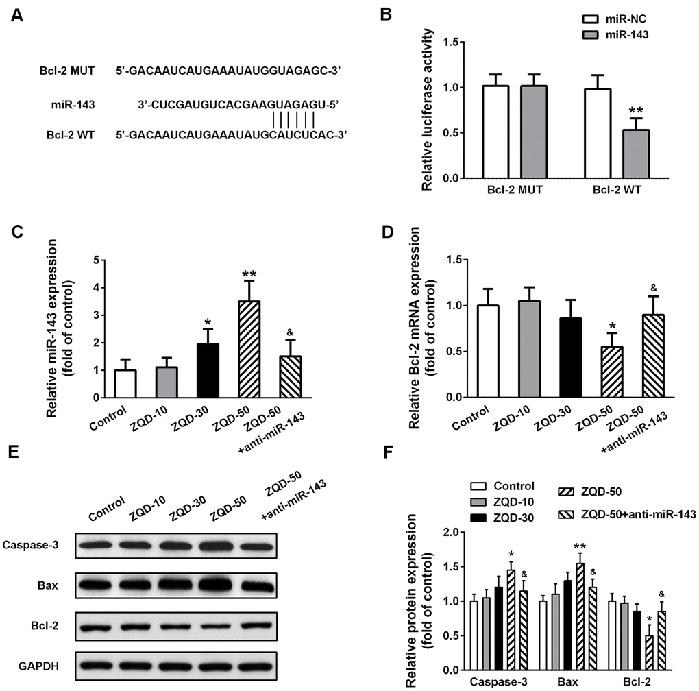To further elucidate the mechanism of ZQD in inhibiting prostate cancer and unveil the role of miR-143 in mediating the effects of ZQD, we performed bioinformatics analysis using Targetscan, which suggested a direct binding site between miR-143 and the 3’-UTR of Bcl-2 (Figure 5A). Luciferase assay validated the interaction between miR-143 and wild-type Bcl-2, but not mutated Bcl-2 (Figure 5B), suggesting that miR-143 efficiently inhibited Bcl-2 (p<0.01). As ZQD dose-dependently upregulated miR-143, anti-miR-143 decreased miR-143 levels (Figure 5C). As a result, ZQD dose-dependently decreased Bcl-2 expression, which was however abrogated by anti-miR-143 (Figure 5D). Consistently, Western blot analysis suggested that ZQD upregulated Caspase-3 and Bax, while downregulated Bcl-2 (Figure 5E, 5F). These results supported the important role of Bcl-2 and miR-143 interaction in promoting the cytotoxic effects of ZQD.
