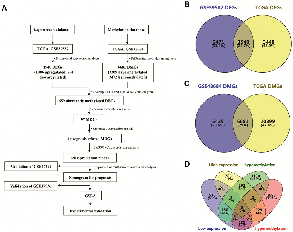 An analysis flow chart of our bioinformatics workflow is shown in Figure 1A. A total of 1940 differentially expressed genes (DEGs) were detected by overlapping date from the TCGA database and GSE39582 (Figure 1B). Similarly, 6681 differentially methylated genes (DMGs) were identified by overlapping TCGA data and GSE48684 (Figure 1C). Subsequently, we overlapped these DEGs and DMGs, and identified 659 aberrantly methylated DEGs, including 129 genes with high expression and hypermethylation, 188 genes with low expression and hypermethylation, 192 genes with high expression and hypomethylation, and 150 genes with low expression and hypomethylation (Figure 1D).