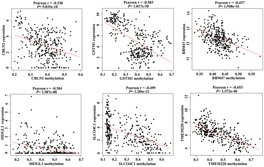 Promoter hypermethylation can trigger transcriptional silencing of cancer-related genes. Therefore, we selected genes with high methylation and low expression for further analysis. We evaluated the Pearson coefficients from gene expression and methylation values for aberrantly methylated DEGs. In total, 97 aberrantly methylated DEGs were identified as MDGs (Pearson coefficient < -0.3 and P < 0.05; Figure 2 and Supplementary Table 1).