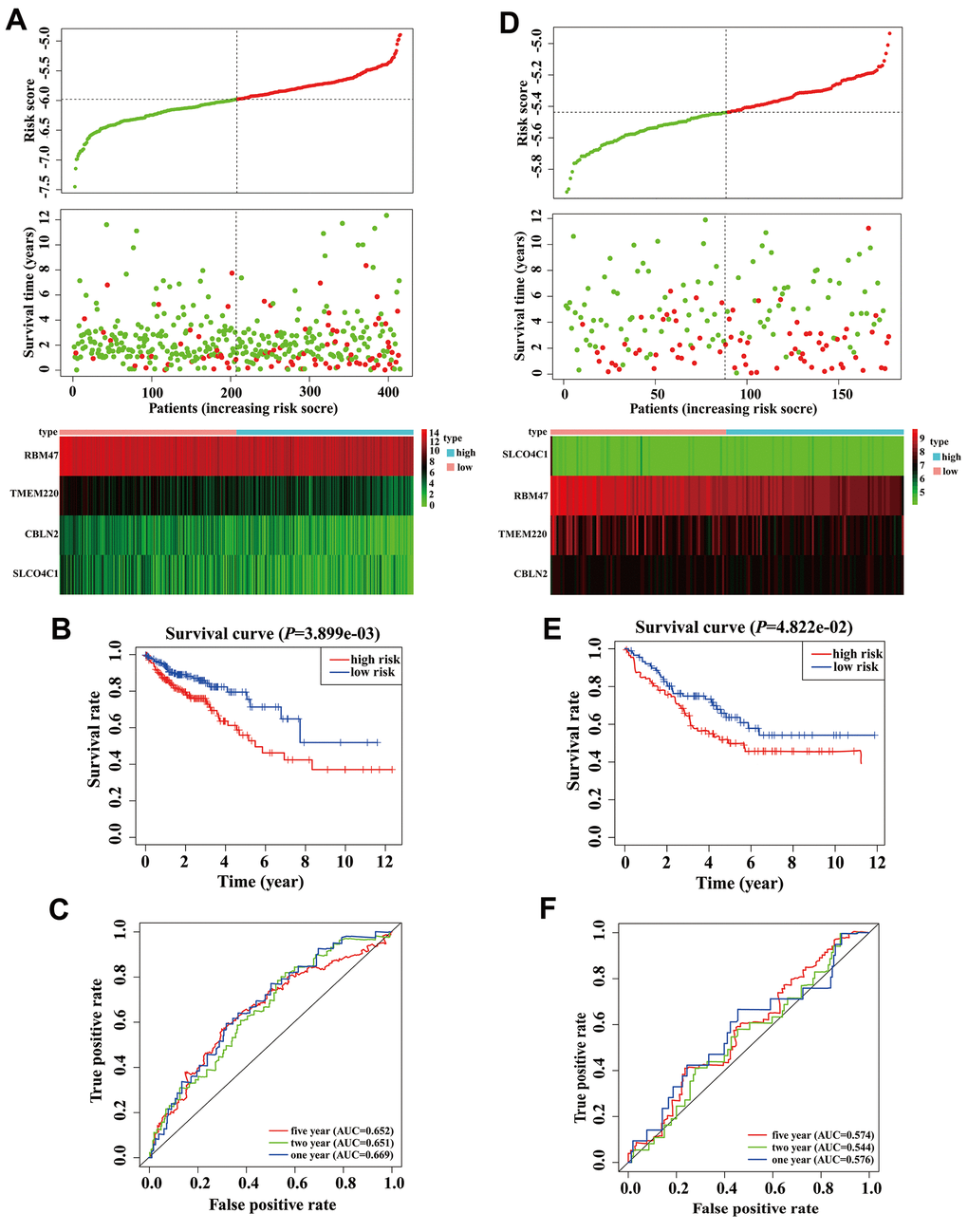 In order to clarify the importance of the four prognostic genes above in COAD patients, we used the GSE17536 array data as an independent validation set. We calculated the risk scores of all patients according to the risk score formula mentioned above. As expected, scatter plots, risk heatmaps and K-M curves were able to accurately distinguish high- and low-risk group patients using this dataset (Figure 3D, 3E). The AUCs of the 1-, 2-, and 5-year OS predictions were 0.576, 0.544, and 0.574 using the GSE17536 array data, respectively (Figure 3F). These results indicated that our model was effective for OS prediction in COAD patients.