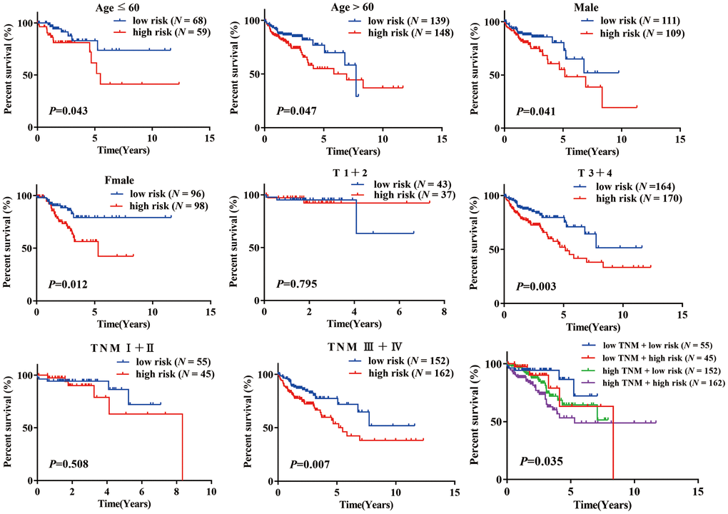 A stratification analysis was then performed to investigate the applicable population using this risk prediction model and TCGA data. Patients were assigned to different subgroups based on their age (≤ 60 / > 60), sex (female/male), T stage (1 + 2/ 3 + 4) and TNM stage (I + II / III + IV). The results showed that our risk prediction model could delineate high- and low-risk patients in each age, sex, T staging, and TNM staging subgroup. Unfortunately, the risk prediction model lost its prognostic value in patients of grade T (1 + 2) and TNM (I + II), which we attributed to the small sample size of these subgroups in the TCGA COAD dataset (Figure 4).