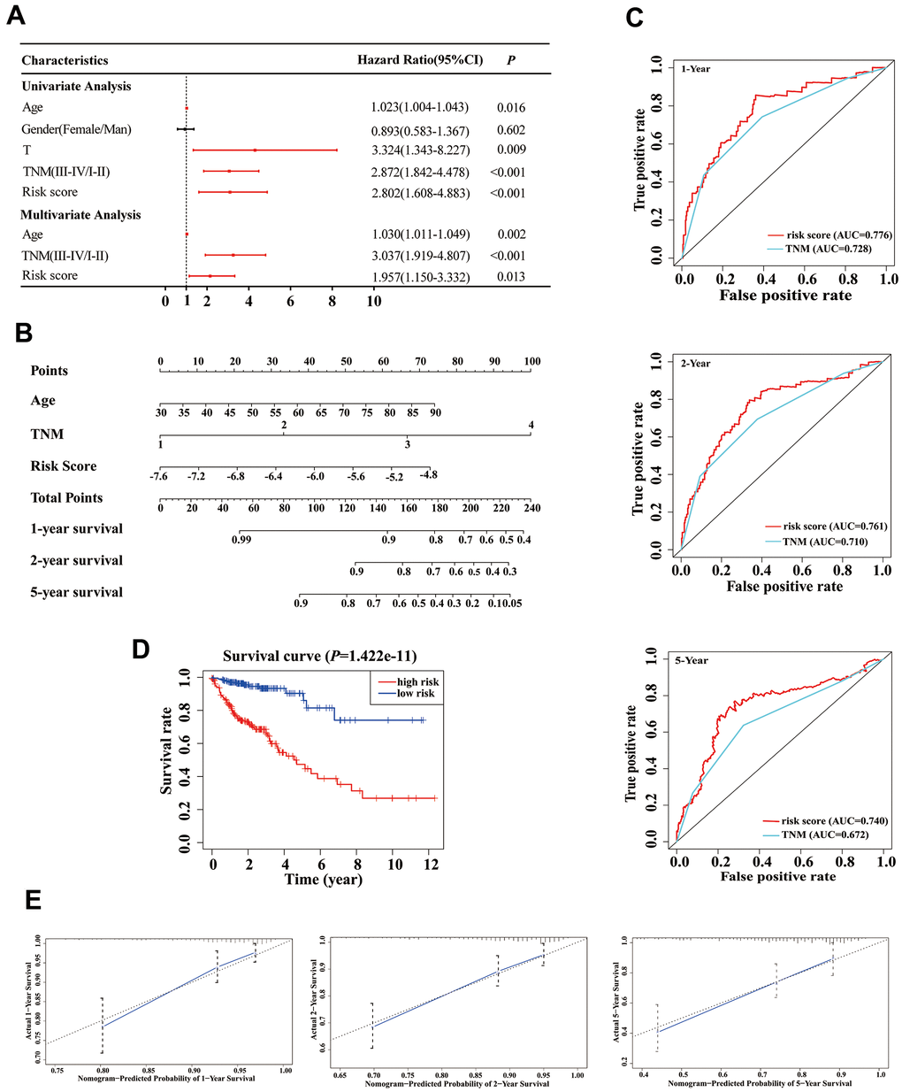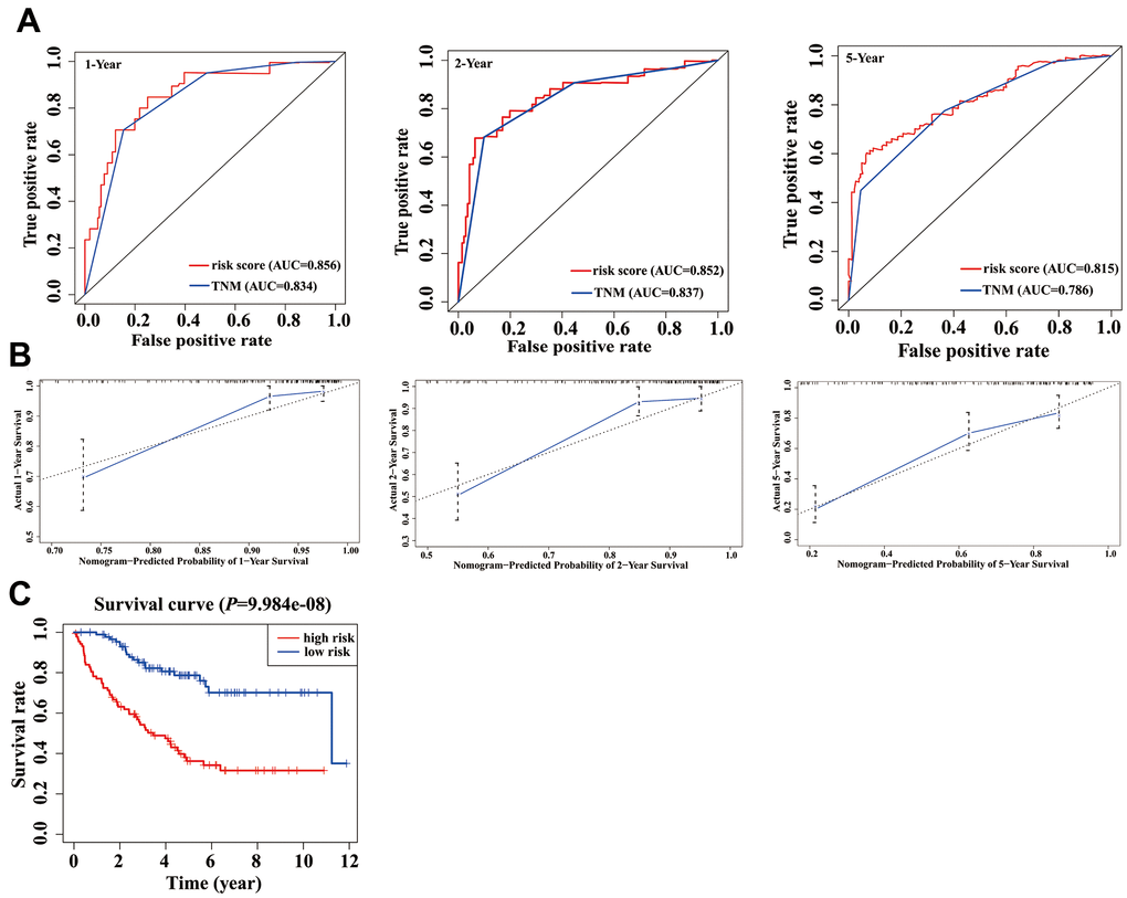 Based on our stepwise and multivariate Cox regression analyses, we found that age, TNM stage and risk score were independent prognostic factors in 414 COAD patients (Figure 5A). Considering the different clinical characteristics of each patient, we built a nomogram that combined age, TNM stage, and risk score to individually predict the 1-, 2-, and 5-year OS of COAD patients (Figure 5B). The AUCs of the 1-, 2-, and 5-year of this nomogram were 0.776, 0.761 and 0.740, respectively (Figure 5C). The AUCs of 1-, 2-, and 5-year prognosis from traditional TNM stage were 0.728, 0.710, and 0.672, respectively (Figure 5C). At the same time, the concordance index (C-index) of the nomogram was significantly higher than traditional TNM stage (0.755 versus 0.706, P < 0.05). Therefore, in terms of predicting the OS of COAD patients, our nomogram was better than traditional TNM staging. Based on the median of the nomogram score as a cutoff value, patients were then divided into high-risk and low-risk groups. K-M analysis revealed that the high-risk group had significantly poorer OS (Figure 5D, P < 0.001). The calibration curves of our nomogram suggested that the predicted OS was consistent with the observed OS (Figure 5E).