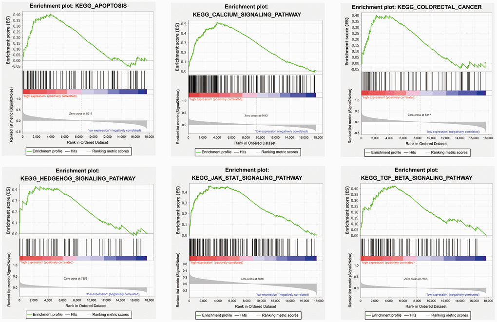 We performed gene set enrichment analysis (GSEA) with our four candidate genes to investigate the potential biological mechanisms via these genes in COAD progression. Patients were divided into high-expression and low-expression groups based on the median expression value of these candidate genes. The results showed that the four candidate genes were involved in multiple tumor-associated pathways, such as the apoptosis, the calcium signaling pathway, the colorectal cancer, the Hedgehog signaling pathway, the JAK-STAT signaling pathway, and the TGF-β signaling pathway (Figure 7, Supplementary Table 2–5).