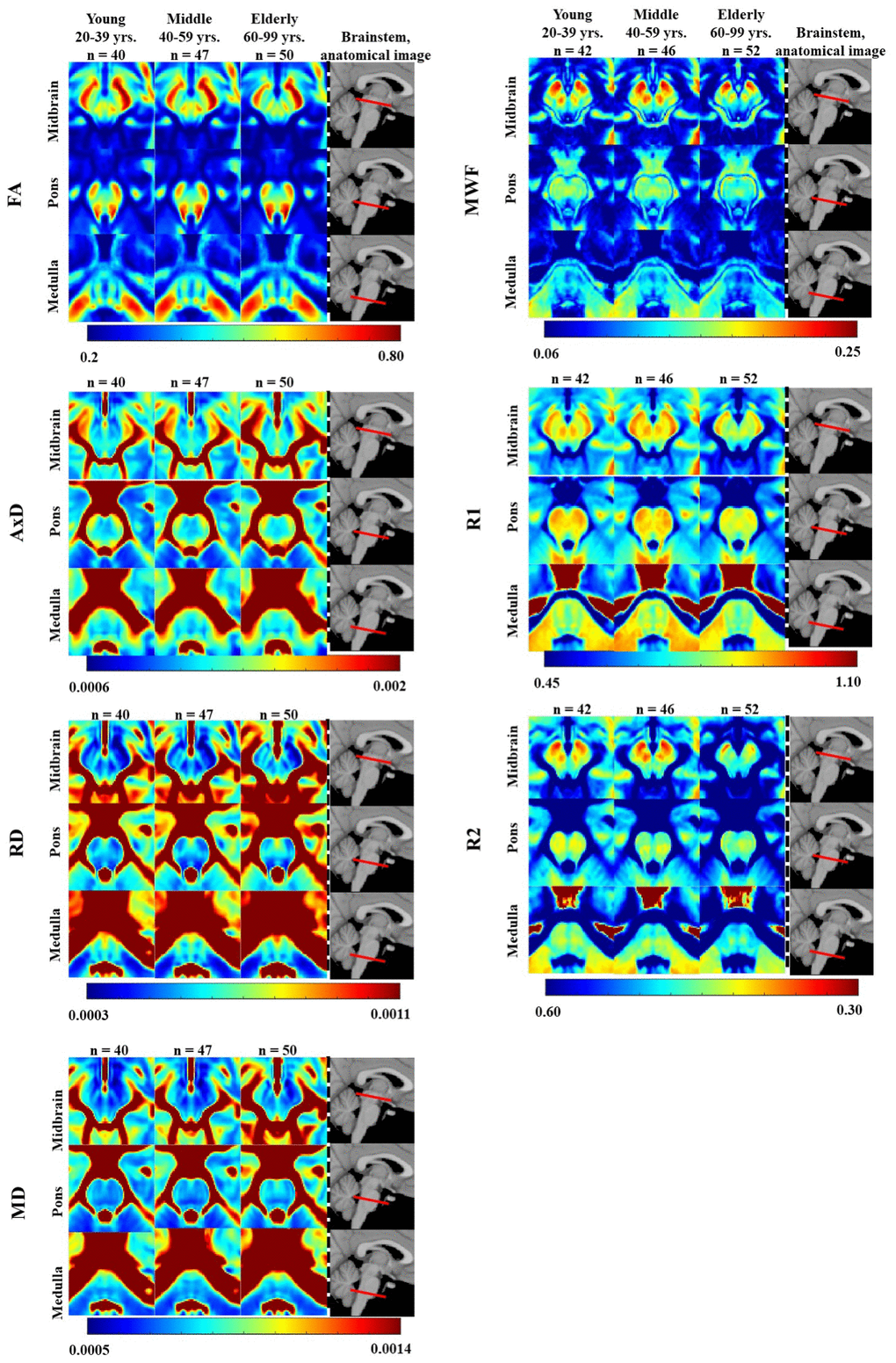 Figure 1 illustrates the regional differences in MWF, R1, R2, FA, MD, AxD, and RD across the adult lifespan, represented with brain parameter maps averaged from participants within three different age intervals of our cohort: young (21-39 years), middle-aged (40-59 years), and elderly (60-94 years). Three representative slices were displayed covering the main anatomical subdivisions of the brainstem, that is, midbrain, pons, and medulla. As expected, the parameter maps exhibit tissue contrast between different brainstem substructures and across age intervals. Visual inspection suggests increases in MWF, R1, and R2 values and decreases in MD, AxD, and RD values from early adulthood, 20-39 years, until middle age, 40-59 years, followed by decreases in MWF, R1, and R2 values and increases in MD, AxD, and RD values at older ages, within several brainstem regions. In contrast, visual inspection of FA maps suggests overall decreases with age within most brainstem regions. Furthermore, we note that the superior brainstem regions, especially the midbrain, exhibit greater MWF, R1, R2, and FA values and lower RD, MD, and AxD values in comparison to the inferior brainstem substructures such as the pons and medulla (Supplementary Tables 1–7).