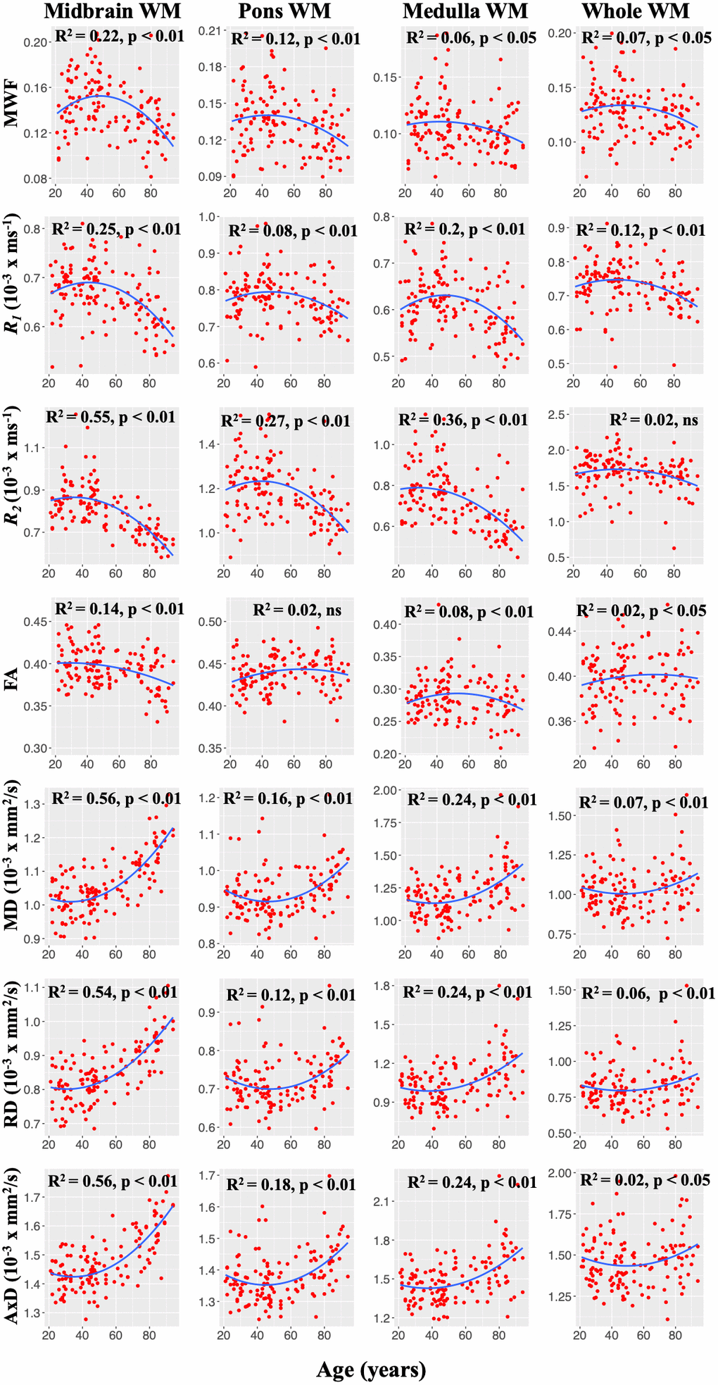 For each ROI, a multi linear regression model was evaluated using the mean ROI values for MWF, R1, R2, FA, MD, RD, or AxD as the dependent variable and sex and age as the independent variables. Examination of Figure 2 indicates that MWF, relaxation rates, and DTI outcomes (RD, MD, and AxD) follow quadratic associations with age in several ROIs. Therefore, we incorporated a quadratic age term, age2, in the regression model. The initial model incorporated interactions between sex and age and sex and age2, which were removed if not significant, with the resulting parsimonious model then evaluated without these nonsignificant interaction terms.