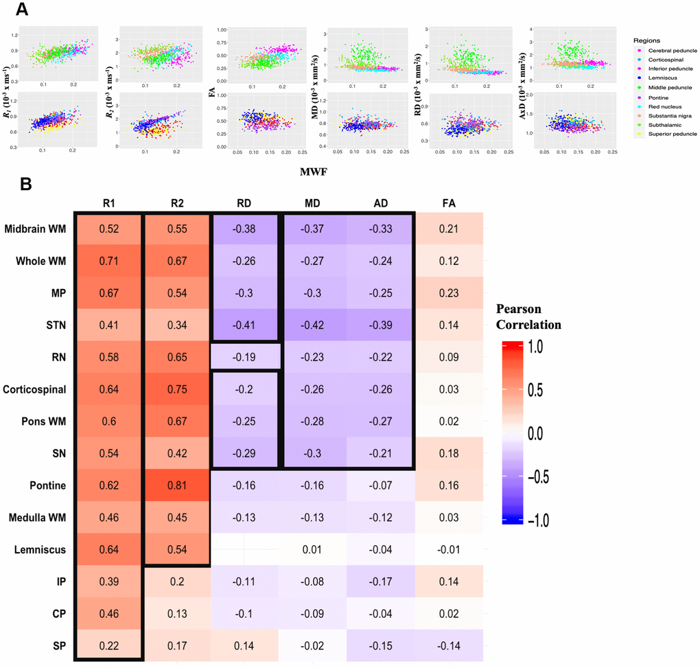 It has been widely assumed that the relaxivity rates and DTI outcomes (especially FA and RD) could serve as specific metrics to probe changes in myelin content with neurodevelopment or pathology [40, 68, 69]. Here, for each ROI, we tested this assumption using Pearson correlation by correlating each derived parameter, that is, R1, R2, FA, MD, RD, or AxD to MWF; this later represents a more specific proxy of myelin content [70–72].