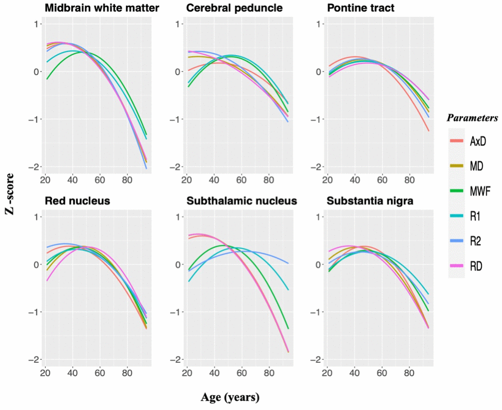 Interestingly, we observed that the variations in the diffusivity indices, that is, AxD, RD, and MD in various substructures during brainstem maturation (age range 20-40) sharply contrast with diffusivity changes in subsequent degeneration (age range 40-90). Specifically, the values of these indices in the midbrain, red nucleus, subthalamic nucleus, and substantia nigra more slowly approach a minimum in middle age while the degeneration phased afterward is significantly more rapid. Normal aging is a dynamic and complex process that attempts to approach a certain equilibrium of myelin and axonal generation or cellular turnover; however, we speculate that this dynamic process shifts towards a predominant degenerative phase at a certain age, perhaps in regions more prone to iron accumulation and lipid peroxidation such as the midbrain and its associated gray nuclei regions. Because the trends differ in MWF and R1 with diffusivity indices and R2, this may also indicate that axons may degenerate at a faster rate than myelin. A more complete confirmation of this interpretation would require further histological or longitudinal studies.