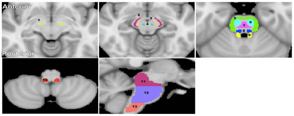 Fourteen brainstem structures were chosen as regions of interest (ROIs) from the Johns Hopkins University (JHU) ICGM-DTI 81 atlas [66, 67] and the Talairach structural atlas provided in FSL to cover all the ROIs for this investigation (Figure 5). ROIs were manually adjusted on single subject-level when needed to reduce partial volume effects and imperfect image registration. Six independent, non-overlapping, white matter ROIs were derived from the JHU atlas; these were the superior cerebellar peduncle, middle cerebellar peduncle, inferior cerebellar peduncle, corticospinal tract, lemniscus tract, and pontine tract. Four additional white matter ROIs were derived from the Talairach atlas corresponding to the midbrain, pons, medulla, and whole brainstem white matter, while three independent, non-overlapping, gray matter ROIs were derived from the same atlas corresponding to the substantia nigra, red nucleus, and subthalamic nucleus. Of note, the pons, medulla, midbrain, and whole brainstem WM ROIs obtained from the Talairach structural atlas encompass all WM within the 10 anatomical subdivisions. The GM within these ROIs was excluded.