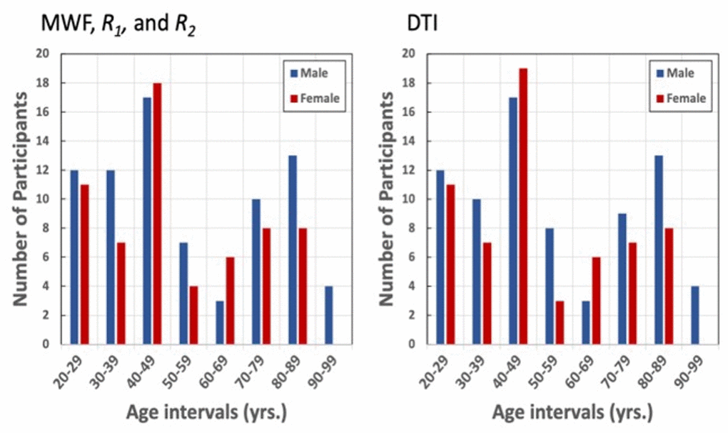 Most ROIs were eroded to reduce partial volume effects and imperfect image registration using a kernel box of 2 voxels × 2 voxels × 2 voxels with the FSL tool fslmaths. The JHU-ICBM atlas ROIs were further superimposed onto the Harvard-Oxford brainstem atlas in FSL to confine the ROIs to the brainstem while avoiding anatomic overlap with nearby brain regions. For each ROI, the mean MWF, R1, R2, FA, MD, RD, and AxD values were calculated for each subject from the normalized space, as well as the mean and standard deviation (SD) parameter values averaged over participants for each age-interval described by Figure 6. We note that the parameter maps calculation, image registration, and ROI segmentation were performed blinded to the participants’ age, sex, and cognitive status.