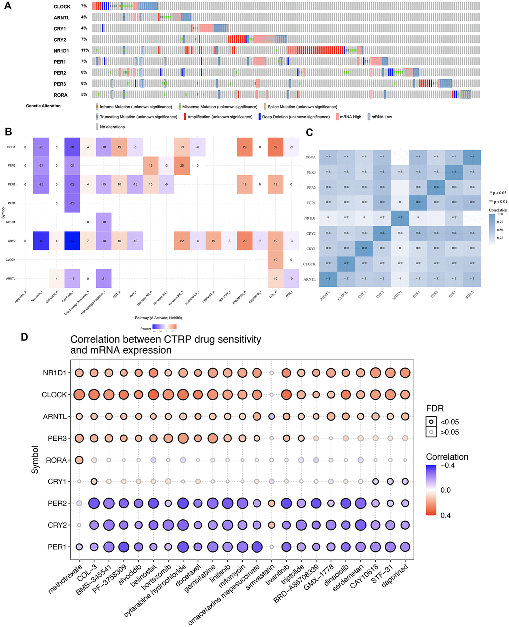 To analyze the correlation between the gene expression of core circadian clock genes and drug sensitivity, we collected small molecules or drugs from the Therapeutics Response Portal (CTRP). We downloaded the area under the dose-response curve (AUC) values for drugs and gene expression profiles for all cancer cell lines. The correlation between gene expression with drug sensitivity (IC50) was explored with Spearman correlation analysis.