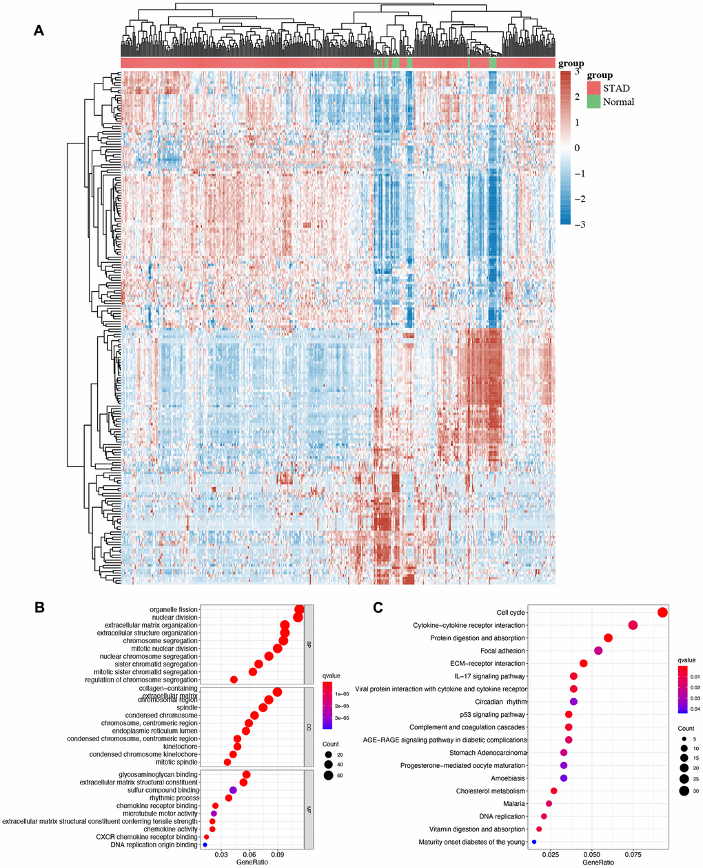 We then performed GO and KEGG analyses using DEGs and the heatmap of DEGs in STAD is shown in Figure 3A. GO analysis demonstrated the correlation of these DEGs in organelle fission, nuclear division, mitotic nuclear division, condensed chromosome, glycosaminoglycan binding, rhythmic process, and chemokine activity (Figure 3B). Moreover, KEGG pathway demonstrated that these DEGs were primarily enriched in the cell cycle, cytokine-cytokine receptor interaction, circadian rhythm, p53 signaling pathway, STAD and DNA replication (Figure 3C).
