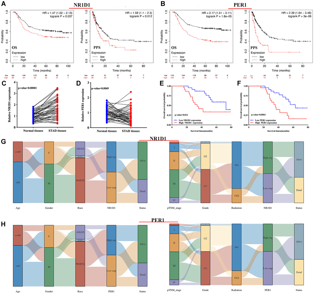 The above results (result 3.4 and result 3.5) revealed that NR1D1 and PER1 may serve as prognostic biomarkers in STAD and are predictors of poor patient prognosis. Thus, NR1D1 and PER1 were selected for further analysis. We then analyzed the association between NR1D1/PER1 expression and clinicopathologic features. As shown in Figure 6G, STAD patients with high pTNM stage and high tumor grade had low NR1D1 expression compared with that of patients with low pTNM and low tumor grade. The PER1 results are presented in Figure 6H. Male STAD patients and patients with high tumor-grade had low PER1 expression.