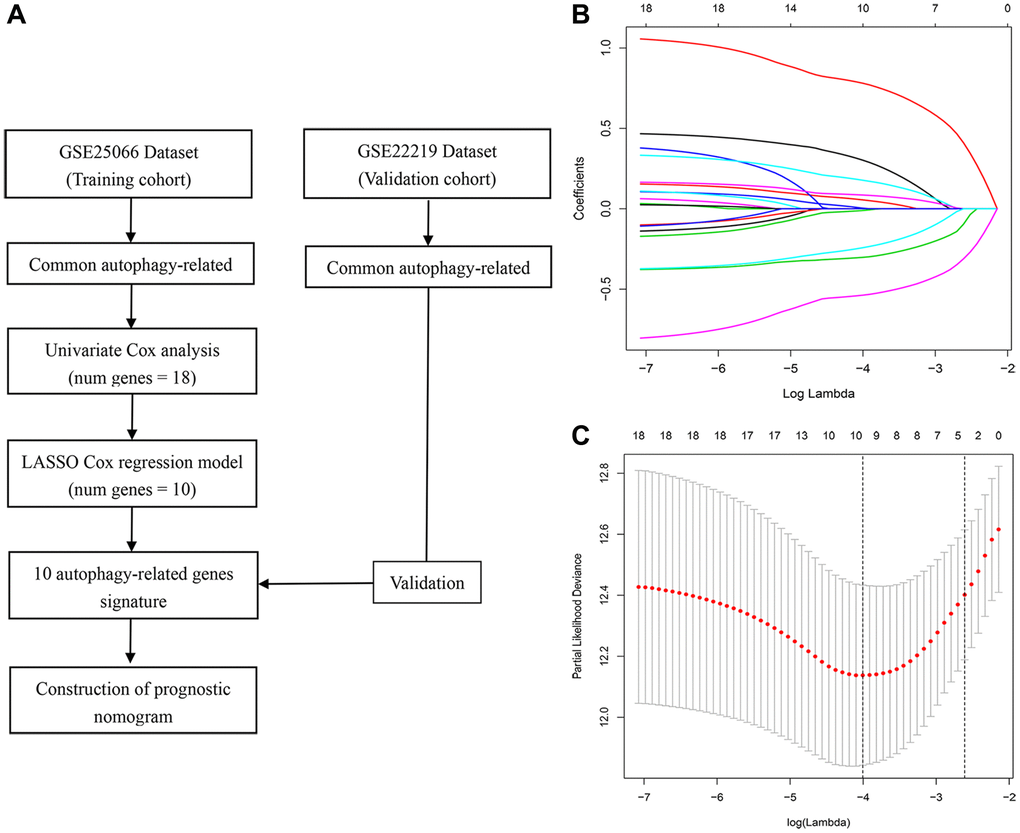 The GSE25066 and GSE22219 gene expression profiles were acquired from the GEO database (https://www.ncbi.nlm.nih.gov/geo/). The GSE25066 dataset is based on the GPL96 [HG-U133A] Affymetrix Human Genome U133A Array and includes data from 310 breast cancer patients. The GSE22219 microarray dataset is based on the GPL6098 Illumina human Ref-8 v1.0 expression beadchip and contains data from 216 breast cancer patients. The GSE25066 dataset was used as training set and the GSE22219 dataset was used as validation set. The autophagy gene list was obtained from the Human Autophagy Database (HADb, http://autophagy.lu/clustering/index.html). This study did not require ethics approval as all data were downloaded from public databases.