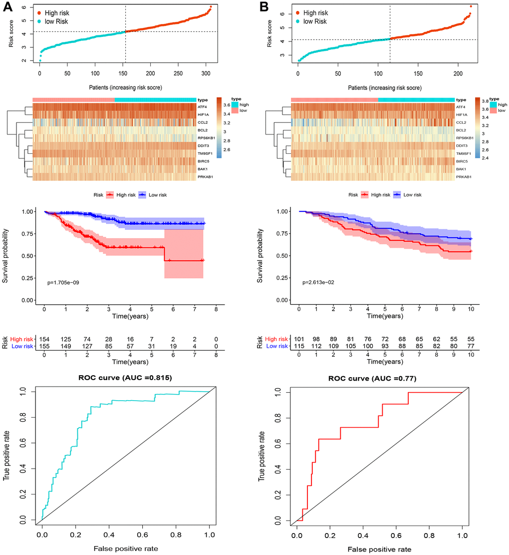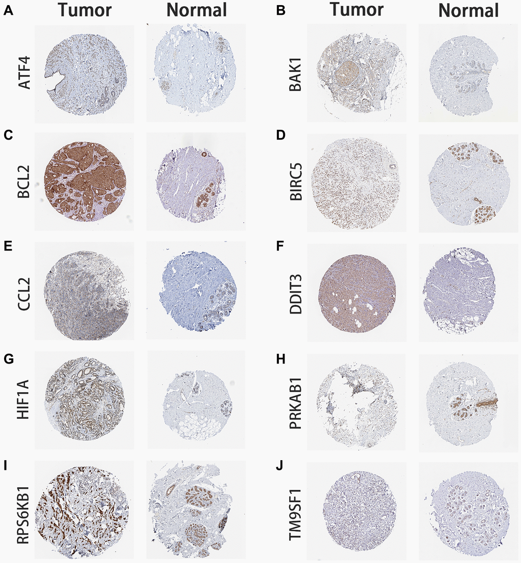 Our BC signature includes 10 autophagy-associated, recurrence-related genes (ATF4, BAK1, BCL2, BIRC5, CCL2, DDIT3, HIF1A, PRKAB1, RPS6KB1, and TM9SF1). Among these, several have been previously investigated in BC. ATF4, a basic region-leucine zipper transcription factor, belongs to the ATF/CREB (activating transcription factor/cyclic AMP response element binding protein) family [20]. ATF4 overexpression was found to be associated with tumorigenesis in a variety of cancers, including BC [20–22]. During the integrated stress response (ISR), ATF4 regulates tumor growth, autophagy, drug resistance, and metastasis through the PERK and GCN2 pathways [23–25]. Milani et al. found that resistance of BC cells to the 26S proteasome inhibitor bortezomib relies on proteasomal stabilization of ATF4, which upregulates LC3B to activate autophagy [26]. Similarly, apoptosis inhibition in paclitaxel-treated BC cells was also shown to result from ATF4-dependent autophagy activation [27]. These results suggest that ATF4 might be a reliable biomarker for poor prognosis in BC and that targeting ATF4-induced autophagy may overcome BC resistance to various chemotherapies. Gao et al. found that ATF4 expression is upregulated in ER-negative BC and its expression is positively correlated with that of PSAT1, an enzyme involved in the serine synthesis pathway. Through in vitro and in vivo experiments, they showed that ATF4 silencing can reduce PSAT1 expression and inhibit cell proliferation and tumorigenesis by blocking GSK3β/β-catenin/cyclin D1 signaling [22]. In turn, Zeng et al. revealed that ATF4 is overexpressed in HER2-positive BC, where it upregulates ZEB1 and inhibits E-cadherin expression to promote cell migration [28].