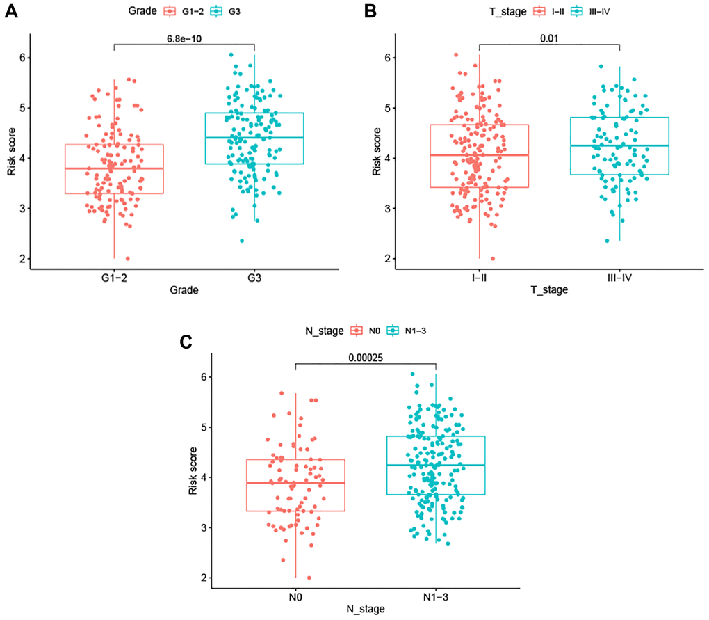 To explore the impact of the signature on the clinicopathological features of BC, we evaluated the correlation of the risk score with four clinicopathological factors (age, grade, and T and N stage).