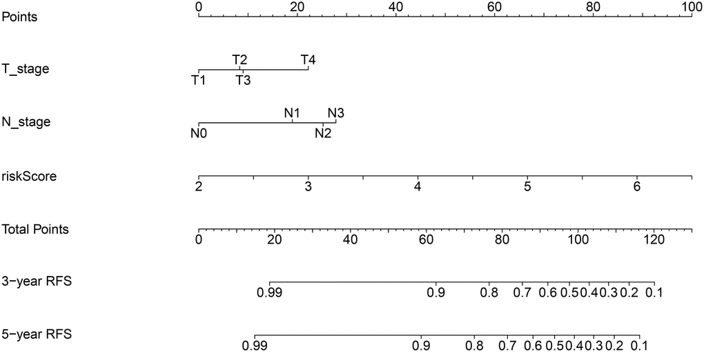 Univariate and multivariate Cox regression analyses were performed to evaluate whether the risk scores are independent prognostic factors for OS. The variables examined included age, ER and PR status (negative and positive), tumor grade, T stage, and N stage. Using p < 0.05 as the cut-off value, we performed univariate Cox’s proportional hazards regression analysis for these variables. Based on the backward stepwise method, we applied a multivariate Cox’s proportional hazards regression model to identify key variables. Then, a nomogram was constructed to predict 3- and 5-year RFS rates in BC patients. The nomogram thus obtained was validated by measuring its discrimination and calibration abilities. We used the area under the curve (AUC) to evaluate our model’s discrimination performance and to assess heterogeneities in its predicting ability (i.e. predicted vs observed results) using the “rms” R package.
