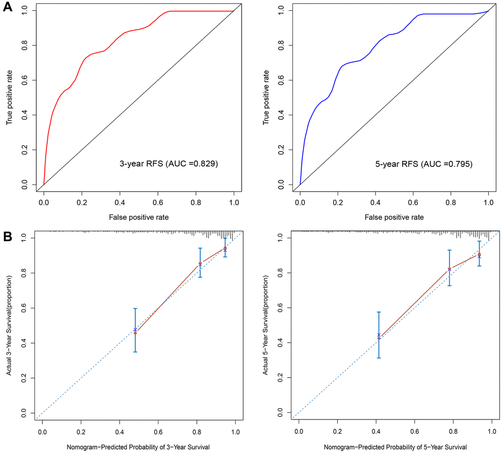 Univariable Cox regression analyses revealed that risk score, grade, ER status, PR status, and T and N stage were significantly associated with RFS. These 6 variables were next subjected to multivariate Cox regression analysis, from which we constructed a nomogram to predict the RFS of patients by integrating T and N stage data with the risk score of the prognostic signature (Figure 5). By combining the scores associated with each variable and projecting the total score to the bottom scale, the estimated 3-year and 5-year RFS probabilities can be easily calculated. The 3-year and 5-year AUC values of the nomogram were 0.829 and 0.795, respectively (Figure 6A). The ROC curves also indicated that compared with the signature only, the nomogram combining the signature and clinical variables had greater predictive accuracy. Calibration curves were then generated to graphically demonstrate the consistency between nomogram prediction and actual prognosis (Figure 6B).