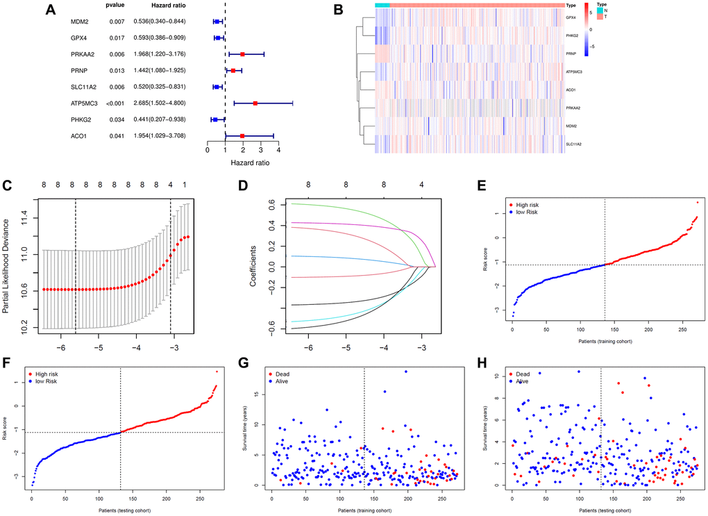 We obtained 87 differentially expressed ferroptosis-related genes (DE-FRGs) (false discovery rate (FDR) < 0.05) through the Wilcoxon test and the “limma” R package between 23 normal samples and 276 training samples. Then, we extracted 12 prognostic FRGs through univariate Cox analysis implemented by the “survival” R package (P < 0.05) (Supplementary Figure 1). Intersecting the 87 DE-FRGs and the 12 prognostic FRGs resulted in eight prognostic FRGs, namely, MDM2, GPX4, PRKAA2, PRNP, SLC11A2, ATP5MC3, PHKG2 and ACO1. From the results of univariate Cox regression analysis, we found that MDM2, GPX4, SLC11A2 and PHKG2 are favorable genes; that is, those with high expression levels of these genes had a good prognosis. PRKAA2, PRNP, ATP5MC3 and ACO1 were unfavorable genes (Figure 1A). From the heatmap in Figure 1B and the mean expression of the eight FRGs in Table 1, we could see that the eight FRGs were abnormally expressed in EC samples compared with normal samples. The expression levels of GPX4, ATP5MC3, SLC11A2,PHKG2 and MDM2 were upregulated in the EC group, while the expression levels of PRNP, ACO1 and PRKAA2 were higher in the normal group.