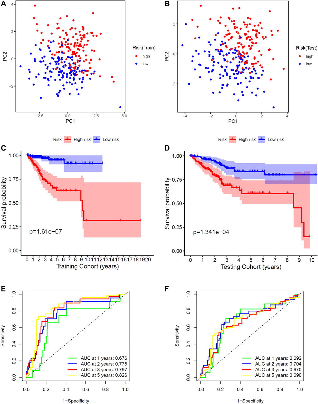 The patients were classified into low- and high-risk subgroups based on the median risk score of the training group. We performed survival analysis to compare the OS between the high- and low-risk groups and showed results via Kaplan-Meier curves. Multivariate Cox analysis, receiver operating characteristic (ROC) analysis, and principal component analysis (PCA) were also performed to test the specificity and sensitivity of the survival prediction.