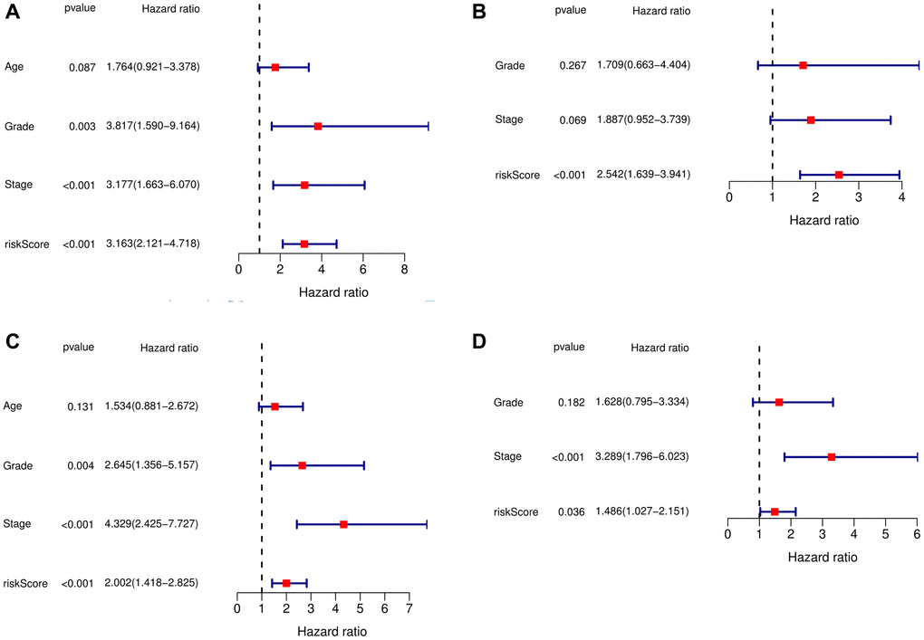 The above analysis showed that this signature performed well. Then, we wanted to determine whether the signature was an independent prognostic factor, so we performed univariate and multivariate Cox regression analyses, which showed that the signature was indeed an independent prognostic factor (Figure 3A–3D).