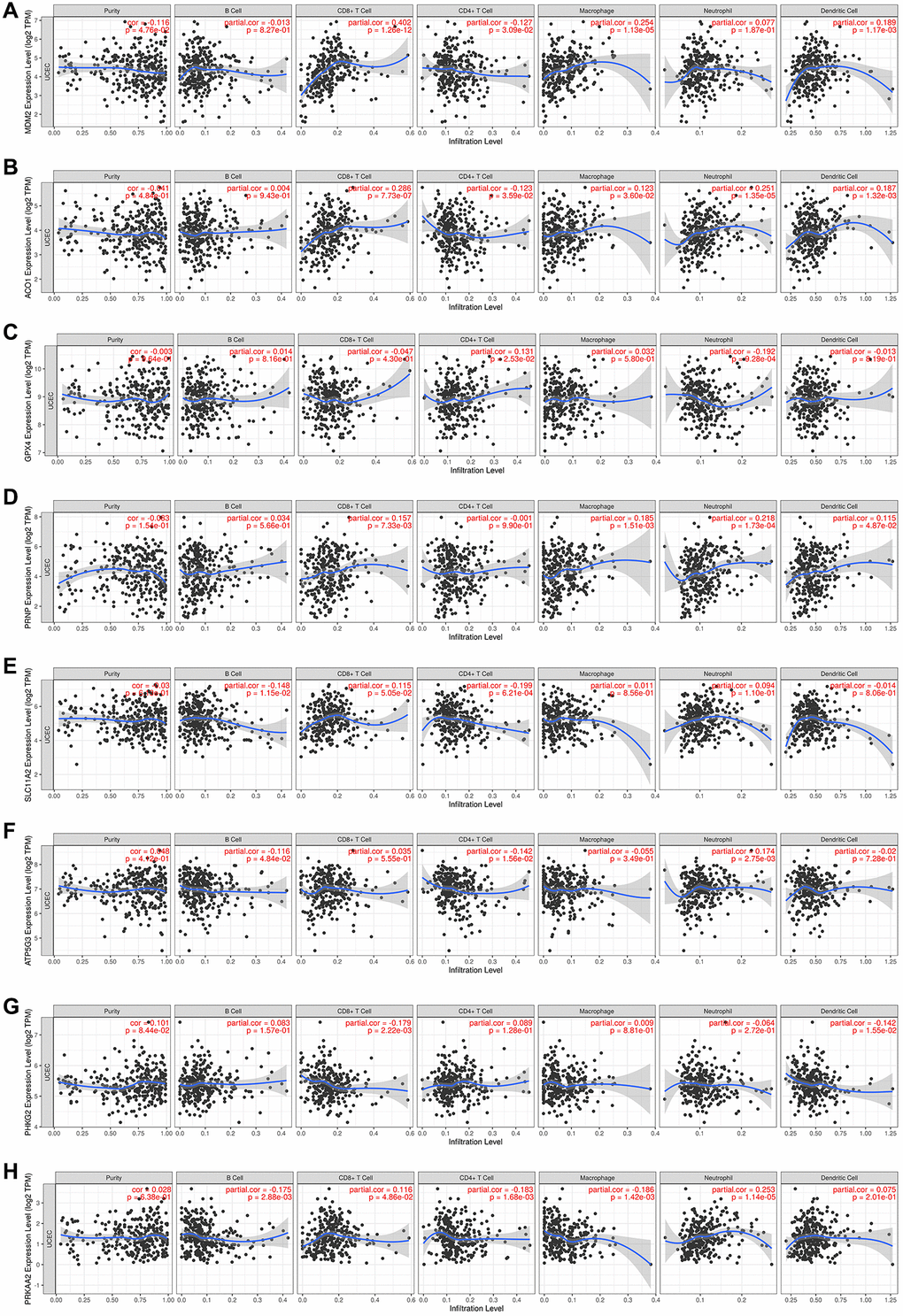 To better understand the relationship between the eight FRGs and TIICs, we searched the TIMER database (Figure 6A–6H). We could see from the left-most panel, which displays the gene expression levels (log2 TPM) against tumor purity, that MDM2 expression was higher in the microenvironment in EC (cor = –0.116, P = 0.048). ACO1, GPX4, PRNP and SLC11A2 may be highly expressed in the microenvironment, but the difference was not statistically significant (cor < 0, P > 0.05). ATP5G3, PHKG2 and PRKAA2 may be highly expressed in tumor cells, but the difference was not statistically significant (cor > 0, P > 0.05). The results also showed that ACO1 was positively correlated with macrophages, neutrophils, CD8+ T cells and DCs (P < 0.05) and negatively associated with CD4+ T cells (cor = 0.123, P = 0.036). ATP5MC3 was negatively correlated with B cells (P = 0.048) and CD4+ T cells and positively correlated with neutrophils (P = 0.003). GPX4 was negatively associated with neutrophils (P < 0.001) and positively associated with CD4+ T cells (P = 0.025). MDM2 was significantly positively associated with CD8+ T cells, CD4+ T cells, macrophages and DCs (P < 0.05). PHKG2 was negatively correlated with CD8+ T cells and DCs (cor < 0, P < 0.05). PRKAA2 was significantly negatively correlated with B cells, CD4+ T cells, and macrophages and positively correlated with CD8+ T cells and neutrophils (P < 0.05). PRNP was significantly positively associated with CD8+ T cells, macrophages, neutrophils and DCs (P < 0.05). SLC11A2 was negatively correlated with B cells and CD4+ T cells.