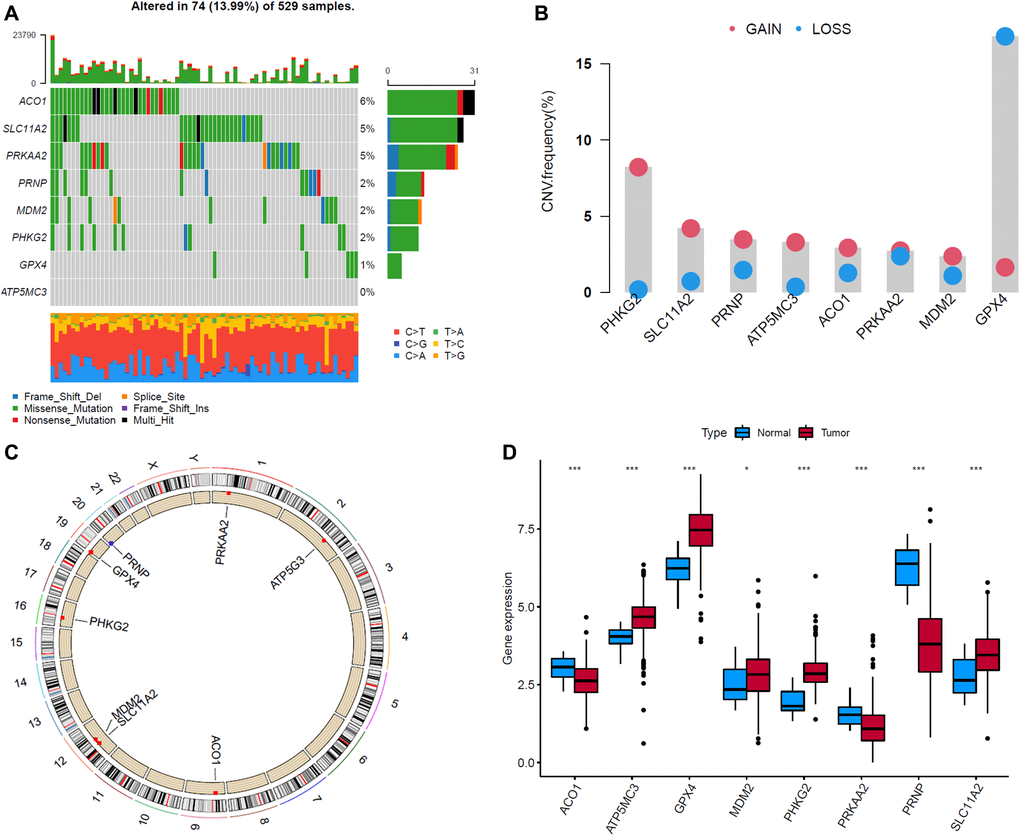 We then summarized the incidence of copy number variations (CNV) and somatic mutations of 8 FRGs in EC. Among 529 samples, 74 experienced alterations of 8 FRGs, with frequency 13.99%. The genetic alteration rates of MDM2, GPX4, PRKAA2, PRNP, SLC11A2, ATP5MC3, PHKG2 and ACO1 were 2%, 1%, 5%, 2%, 5%, 0%, 2% and 6%, respectively. Most of their genetic alteration type was missense mutation (Figure 7A). The investigation of CNV alteration frequency showed most were focused on the amplification in copy number, while GPX4 had a widespread frequency of CNV deletion (Figure 7B). The location of CNV alteration of FRGs on chromosomes was shown in Figure 7C. To ascertain whether the above genetic alterations influenced the expression of FRGs in EC patients, we investigated the mRNA expression levels of FRGs between normal and EC samples, and found that the alterations of CNV was not the prominent factors resulting in perturbations on the GPX4, ACO1 and PRNP expression. Compared to normal endometrial tissues, genes with amplificated CNV demonstrated markedly lower expression in EC tissues (e.g., ACO1 and PRNP), and vice versa (e.g., GPX4) (Figure 7C, 7D). The alterations of CNV could be the prominent factors resulting in perturbations on the PHKG2, SLC11A2 and ATP5MC3 expression. They exhibited higher expression in EC tissues, companied with amplificated CNV. The above analyses indicate a high degree of heterogeneity in the landscape of genetic and expressional alterations in FRGs between normal and EC samples.