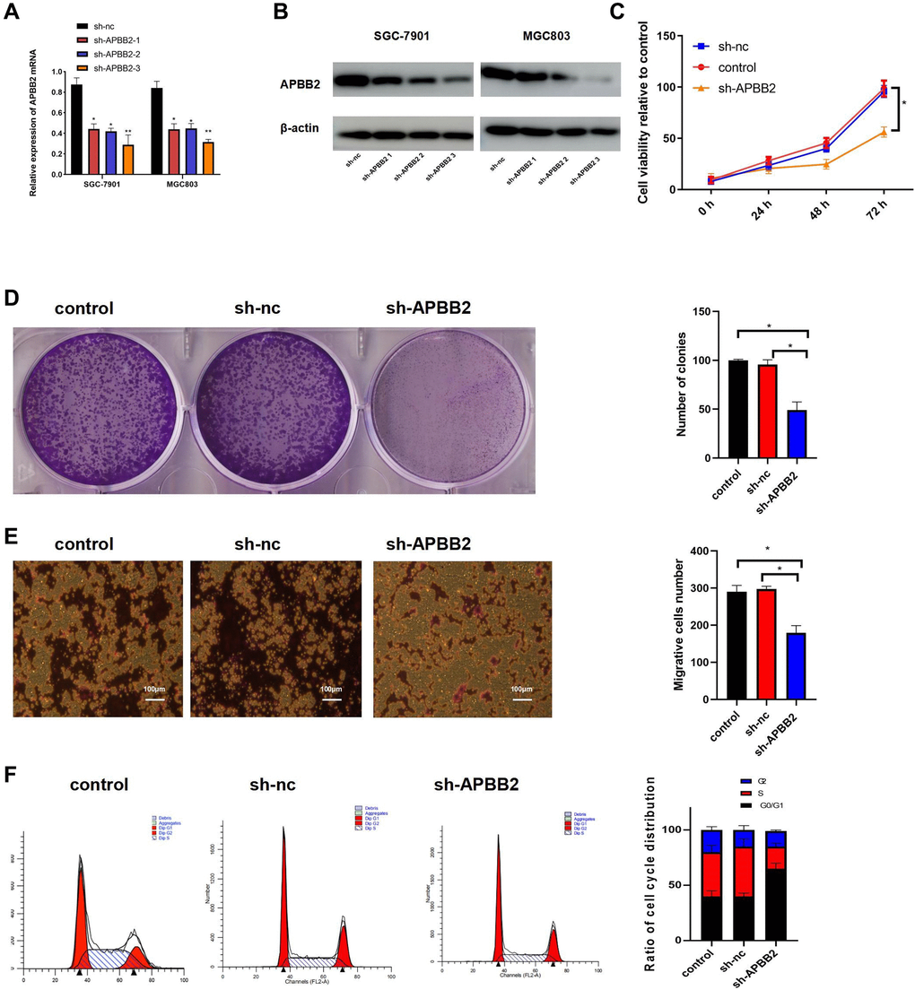 The level of APBB2 mRNA expression was down-regulated in SGC-7901 and MGC803 cells using sh-APBB2 transfection (Figure 2A). The Western blot images showed similar results at the protein level (Figure 2B). Since sh-APBB2-3 was associated with the most significant decrease in SGC-7901 and MGC-803, it was selected for subsequent experiments. The down-regulation of APBB2 expression was found to attenuate the proliferation (Figure 2C), colony formation (Figure 2D), and invasion ability (Figure 2E) of SGC-7901 cells. Compared with the control group, there was a significant increase in the proportion of cells in the G0/G1 phase of the cell cycle in the sh-APBB2 group as assessed by FCM (Figure 2F). These findings indicate that the inhibition of GA cell proliferation was induced by decreased APBB2 expression.