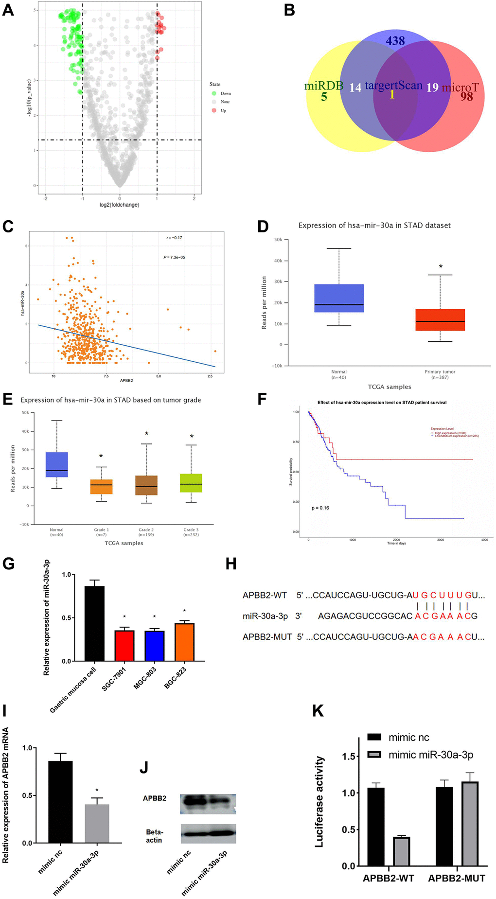 To explore the mechanism of APBB2 expression in GA, an in-depth analysis of the regulatory pathways located upstream of APBB2 was conducted. A total of 89 different miRNAs were obtained to perform a differential analysis (Figure 3A). The potential upstream miRNAs of APBB2 were predicted using miRDB, targetscan, and microT databases. miR-30a-3p was obtained from the inter-section of 66 down-regulated miRNAs (Figure 3B). A Pearson correlation analysis revealed that there was a negative correlation between miR-30a-3p and APBB2 (Figure 3C). An analysis of the TCGA-GA database revealed low miR-30a-3p expression in the tumor tissues (Figure 3D). In addition, miR-30a-3p expression was decreased in relation to the progression of clinical stages (Figure 3E) of GA. The above evidence was in accordance with the data gained from other cell lines (Figure 3E). A Kaplan-Meier analysis of TCGA-GA dataset revealed that GA patients exhibiting higher miR-30a-3p expression were associated with a longer survival period (Figure 3F).