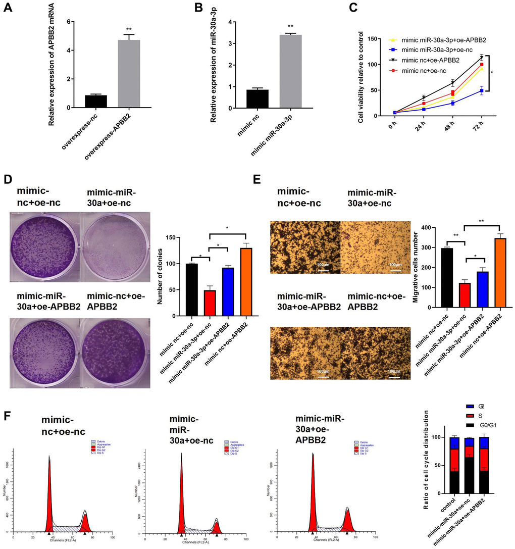 Next, we further explored the effects of miR-30a-3p expression on APBB2-related cell functions. The efficiency of the APBB2 overexpression (Figure 4A) and miR-30a-3p mimic (Figure 4B) was evaluated. Compared with the control group, the cell proliferation (Figure 4C), colony formation (Figure 4D), and transwell (Figure 4E) assays showed that APBB2 overexpression promoted GA cell proliferation, cell viability, and invasion, which could be inhibited by the miR-30a-3p mimic. Moreover, the cell cycle FCM results also confirmed that the miR-30a-3p mimic effectively blocked GA cells in the G0/G1 phase, which could attenuate GA cell proliferation (Figure 4F). Together, our results demonstrate that miR-30a-3p inhibited the biological function of GA cells, which could be reversed by APBB2 overexpression.