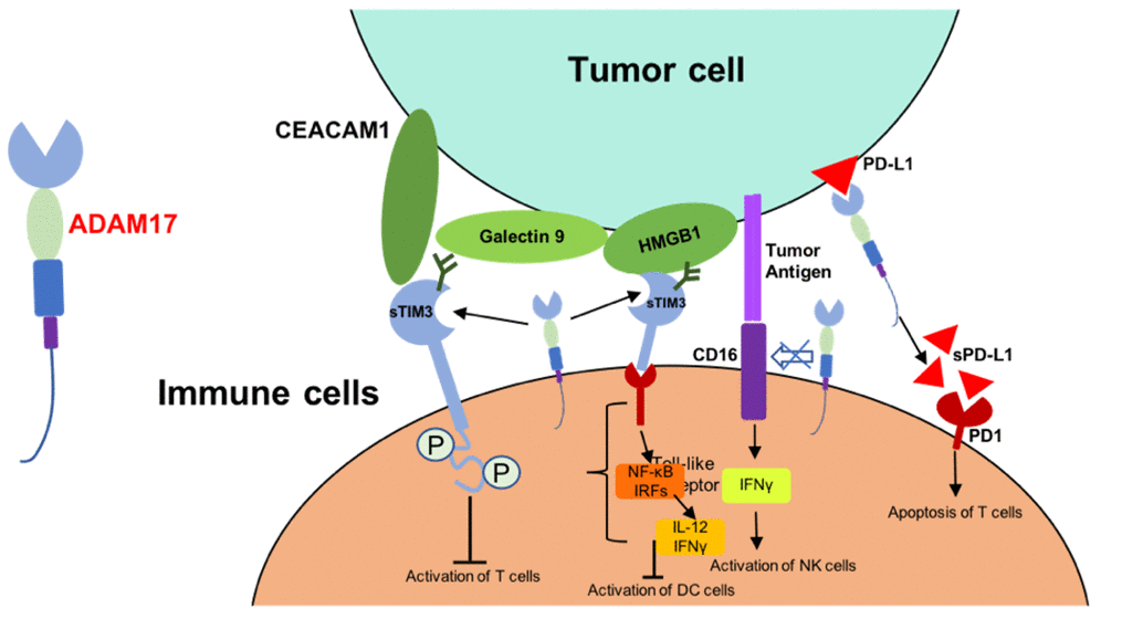 T cell immunoglobulin and mucin domain-containing protein 3 (TIM3) was one of the cell surface receptors of CD4+ CD8+ T cells [75, 76]. TIM3 was identified as substrates of ADAM17, and soluble TIM3 could bind to carcinoembryonic antigen-related cell adhesion molecule 1 (CEACAM1), galectin9 and high mobility group protein B1 (HMGB1), and thus lead to reduced antitumor activity of immune cells [75, 77, 78]. On the other hand, shedding of membrane-bound CD16 by ADMA17 decrease the expression of IFNγ and other cytokines which are necessary for the activation of immune cells [73]. ADAM17 was associated with the increased soluble PD-L1 from tumor cells. This regulation of ADAM17 induce the apoptosis of T cells and compromise the killing effect of CD8+ T cells [74] (Figure 2). All these suggested that inhibitors of ADAM17 and may be correlated to the tumor targeted therapy selection.