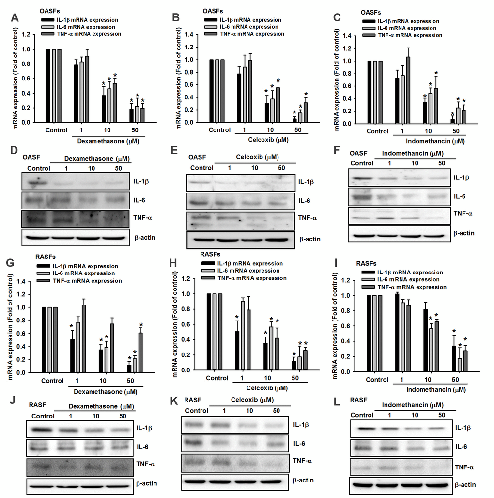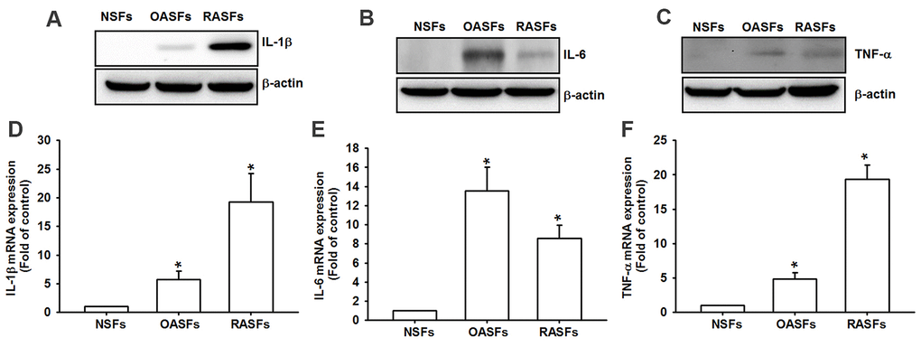 Similarly to previous research [8], we found markedly higher levels of IL-1β, IL-6 and TNF-α protein and mRNA in OASFs and RASFs than in NSFs (Figure 1), indicating that these cytokines regulate OA and RA progression.