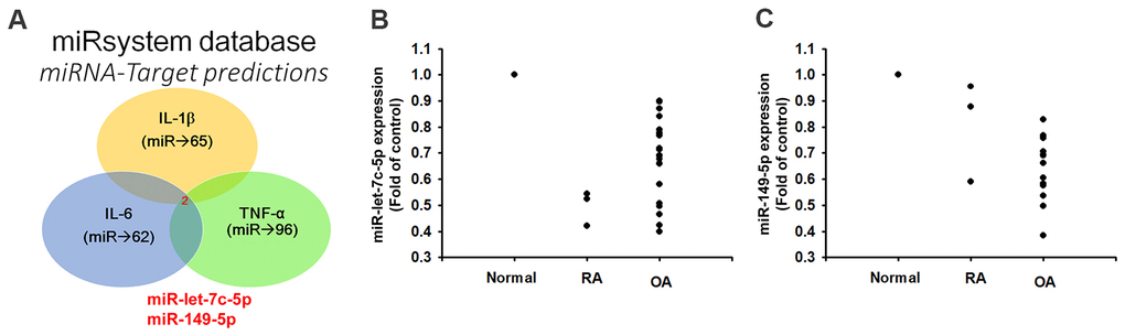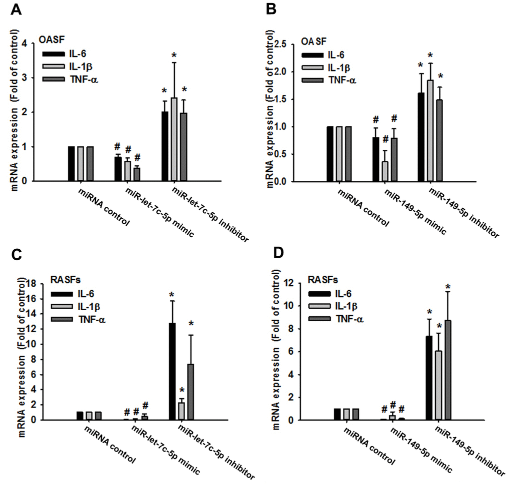The progression of arthritis disease is regulated by several microRNAs (miRNAs), including miR-92a, miR-129-3p, miR-141-3p and miR-199a-5p [9–12], while the proinflammatory mediators IL-1β, IL-6, TNF-α and matrix metalloproteinases (MMPs) account for histological changes that occur with arthritis [13–15]. However, how miRNAs might regulate the progression of OA and RA remains unclear. We describe finding higher levels of proinflammatory cytokines in OA synovial fibroblasts (OASFs) and RASFs than in normal SFs (NSFs), while miR-let-7c-5p and miR-149-5p were associated with reductions in proinflammatory cytokine expression. Treatment of OASFs and RASFs with anti-inflammatory agents enhanced levels of miR-let-7c-5p and miR-149-5p expression and reduced proinflammatory responses. Thus, finding ways to promote the expression of these miRNAs may be of therapeutic benefit for patients with OA or RA.