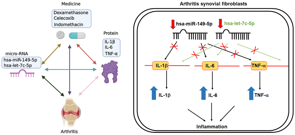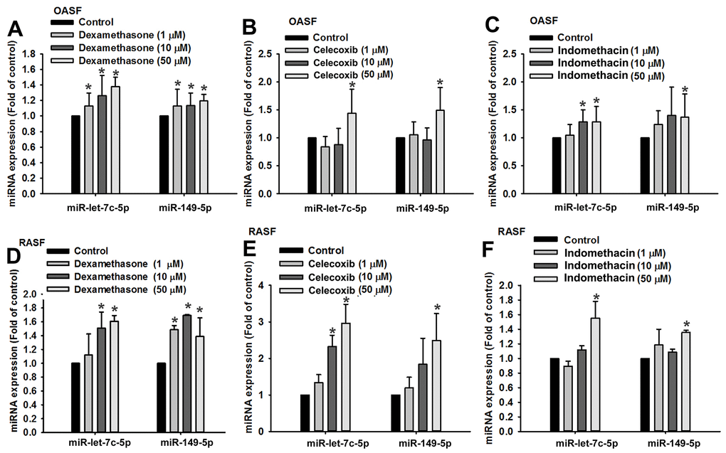 Anti-inflammatory agents (e.g., corticosteroids, COX-2 selective inhibitors and NSAIDs), are well recognized for their modulation of inflammatory responses in different inflammatory diseases, including arthritis [16]. Our study results confirm that dexamethasone, celecoxib and indomethacin effectively lower the synthesis of arthritic inflammatory cytokines, including IL-1β, IL-6 and TNF-α, in both OASFs and RASFs, by upregulating miR-let-7c-5p and miR-149-5p expression. Our genetic and pharmacologic investigations suggest that enhancing the levels of these miRNAs may be a novel avenue for treating OA and RA.