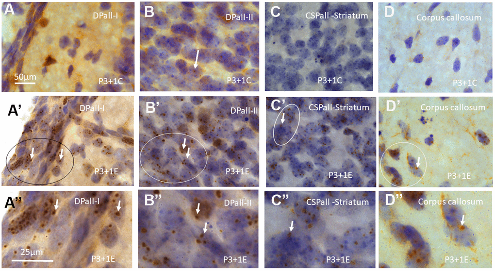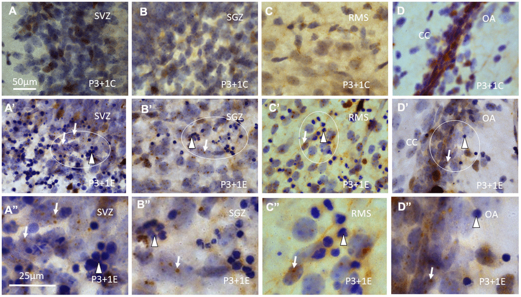 One day after irradiation at P10 or P21, many γH2AX foci were observed in the layers II to VI of the DPall, in the stratum pyramidale of CA1-3 areas and stratum granulosum of the dentate gyrus in MPall (Table 1). They were also found in the brain regions involved in neurogenesis and neuronal migration, i.e., SVZ, SGZ, olfactory bulb (OB), rostral migratory stream (RMS) and temporal migratory stream (TMS) (TelA) and CSPall. Increased γH2AX foci were also demonstrated in the striatum and thalamus. However, there was no obvious change of γH2AX foci in the pia mater, white matter, the stratum moleculare of the dentate gyrus, strata laculosum moleculare, radiatum, oriens of CA1-3 areas of the hippocampus in MPall and in the cerebrovascular system (Table 1). These changes were similar to those occurred at 7 days after irradiation at P3. At 7 days after irradiation at P10, there was similar patterns of γH2AX foci distribution to 1 day after irradiation.