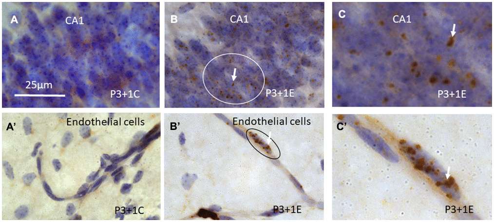 To further analyse cellular localization of γH2AX foci at 1, 7 and 120 day(s) after irradiation at P3, P10 and P21 respectively, coverslip was removed after stereological analysis by immersing slides in sequence in Histo-Clear, 100%, 95%, 75%, 50%, 25% ethanol, and then in ultrapure water. The sections were then counterstained with hematoxylin and covered with coverslip.