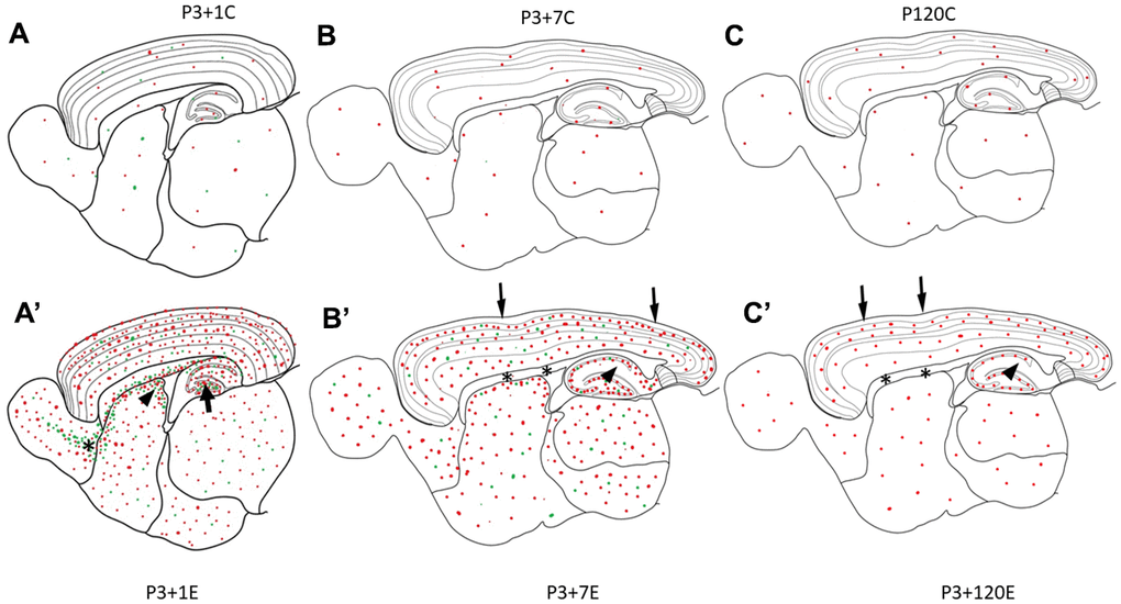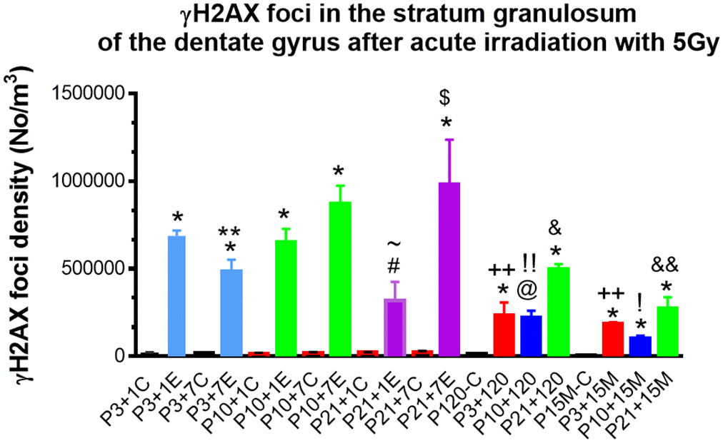 For unbiased counting of γH2AX foci in the stratum granulosum of the dentate gyrus, the Stereologer from Stereology Resource Center Biosciences, Inc. (SRC Biosciences, Florida, USA) was used. Three (P3+1, P3+7, P10+1, P10+7) to six (P21+1, P21+7, P120-control P3+120, P10+120, P21+120, P15M-control, P3+15M, P10+15M, P21+15M) brain sections from individual mouse were counted. γH2AX foci were counted at 400×, and indicated as the number of foci/mm3 in the stratum granulosum of the dentate gyrus. All the data were then analyzed by one-way ANOVA followed by student’s t-test. Statistical significance was considered at P<0.05.