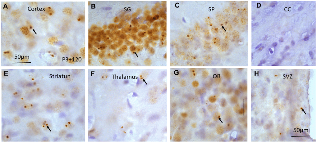 Four months (120 days) after irradiation with 5 Gy at P3, P10 and P21, some γH2AX foci or PDDF could still be observed in the layers II-III of cortex (Figure 6A), the stratum granulosum of the dentate gyrus (Figure 6B), and the stratum pyramidale of CA1-3 areas of the hippocampus (Figure 6C). γH2AX foci were almost undetectable in the corpus callosum although these foci still existed in the striatum (Figure 6E), thalamus (Figure 6F), olfactory bulb (Figure 6G) and subventricular zone of the lateral ventricle (Figure 4, Figure 6H) (Table 1) although the number of γH2AX foci was decreased when compared to those at 1 and 7 days after radiation exposure.