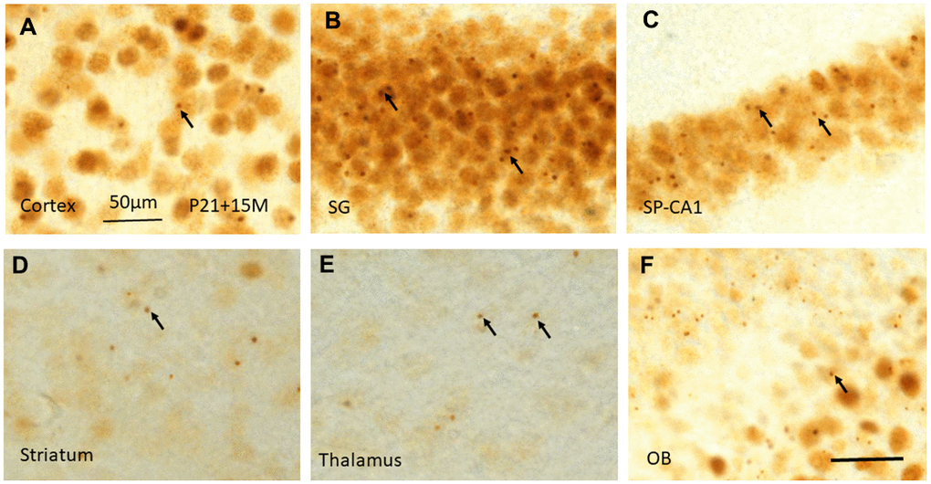 Fifteen months (15M) after irradiation at P3, P10 and P21, similar γ-H2AX foci or PDDF could be observed as those at 120 days in the layers II-III of cortex (Figure 7A). They were also noted in the stratum granulosum of the dentate gyrus (Figure 7B), and the stratum pyramidale of CA1-3 areas of the hippocampus (Figure 7C), in the striatum (Figure 7D), thalamus (Figure 7E), olfactory bulb (Figure 7F) (Table 1). It suggested that γ-H2AX foci might be localized in those neurons involved in major brain activities such as sensation, locomotor, and learning and memory.