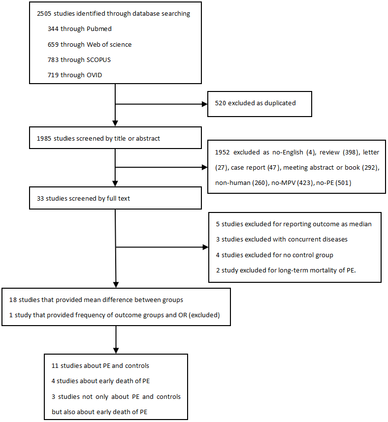 Studies were excluded if they were duplicates, non-English, reviews, letters, case reports, books, meeting abstracts (with no data of the outcome), nonhuman, did not provide data of MPV, did not include an outcome of PE or early death, and did not include a control group. Further, studies that reported MPV with median values and studies in which participants had concurrent diseases that influenced the outcomes of interest were also excluded. For the same study with several publications, we chose the most recent data or the paper with the longest follow-up, or we contacted the primary/corresponding author to confirm differences between these studies, when necessary.