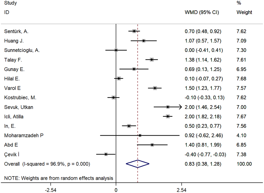 In the meta-analysis of studies on PE, a larger MPV was found in cases versus controls with a WMD of 0.83 fL (95% CI: 0.38-1.28, P<0.001). However, the heterogeneity was substantial, and hence, a random effects model was used (chi-square = 418.81, df =13, I2 =96.9%, P<0.001) (Figure 2). A meta-regression analysis was conducted, and the results showed that age, smoking and type of disease might be sources of heterogeneity (coefficient=-0.076, P=0.007; coefficient=-1.17, P=0.001; coefficient=1.34, P<0.001, respectively). The subgroup analysis showed disease type might be a source of heterogeneity and the pooled MD of MPV in the subgroup of PE patients with DVT was more significant than that without DVT (Figure 3 and Supplementary Table 2). The sensitivity analysis suggested that the finding regarding the role of MPV in PE was robust because pooling MPV and the heterogeneity did not vary substantially, no matter which study was removed (Figure 4 and Supplementary Table 3). The funnel plot presented symmetry (Supplementary Figure 1), and Begg’s test and Egger’s test did not reveal evidence of publication bias (Begg’s test, P=0.584; Egger’s test, P=0.145).