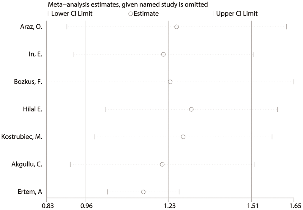 Characteristics of each study on early death of PE are shown in Table 1 and Supplementary Table 4. The pooled MD of MPV between those who died and survivors was approximately 1.23 fL (95% CI: 0.96-1.51, P<0.001). A random effects model was used for large heterogeneity (chi-square=18.61, df=6, I2=67.8%, P=0.005). The subgroup analysis found that disease type might be a source of heterogeneity, which was significantly declined in the subgroup of PE patients with DVT. (Figure 5 and Supplementary Table 5). The sensitivity analysis indicated a stable pooling result (Figure 6 and Supplementary Table 6). However, the heterogeneity lowered to 0.6% after removing the study by Ertem AG, et al. [31], in which more than half of the patients had DVT as a complication. In addition, the funnel plot exhibited significant asymmetry, reflecting the existence of publication bias (Supplementary Figure 2).