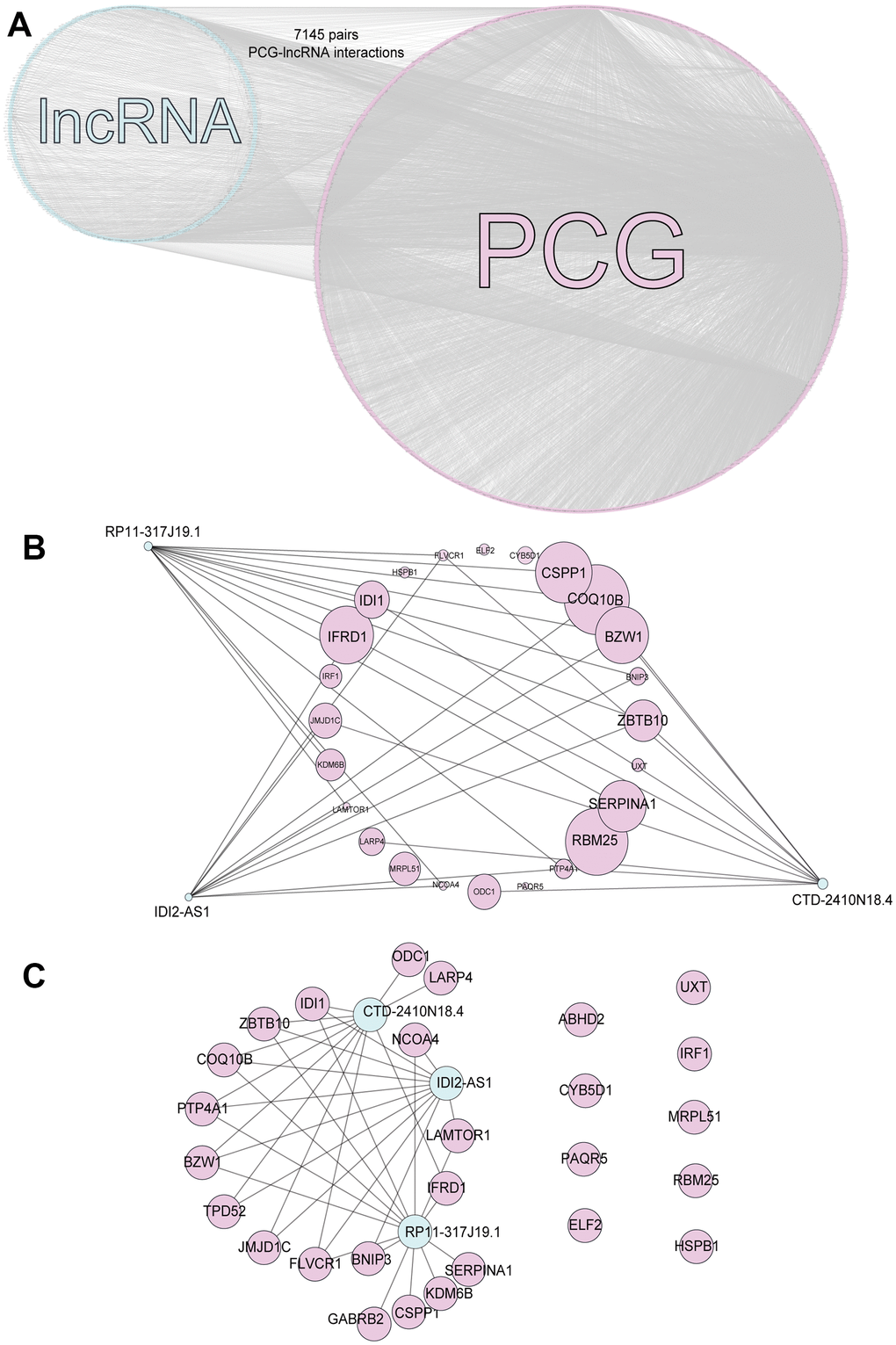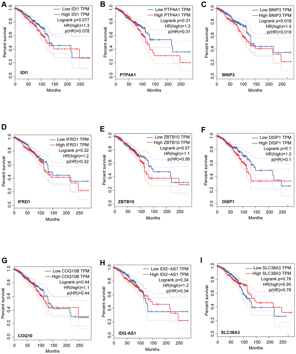 We identified that the lncRNA RP11-317-J19.1 and PTP4A1 acted on BNIP3, which plays a key role in cell apoptosis and autophagy (Figure 4E, 4F) [16–19]. The gene-lncRNA interaction diagram revealed a subtle interaction between the five differentially expressed genes and differentially expressed lncRNAs in the yellow module (Figure 5A, 5B). To validate the gene-lncRNA interactions in the yellow module, we created gene correlation scatter plots for IDI2-AS1 and IDI1, IDI2-AS1 and PTP4A, IDI2-AS1 and BNIP3, PTP4A and IDI1, BNIP3 and IDI1, as well as PTP4A and BNIP3 (Figure 5C). The results revealed that the expression levels of BNIP3 and PTP4A were significantly positively correlated with that of IDI1 (p < 0.05), whereas those of BNIP3 and PTP4A were significantly negatively correlated with those of IDI2-AS1 (p < 0.05). Moreover, the Kaplan-–Meier plots showed that seven genes and two lncRNAs in the core driver gene network and co-expression yellow module were correlated with overall survival, including IDI1, PTP4A1, BNIP3, IFRD1, ZBTB10, DISP1, COQ10B, IDI2-AS1, and SLC38A3 (Figure 6A–6I).