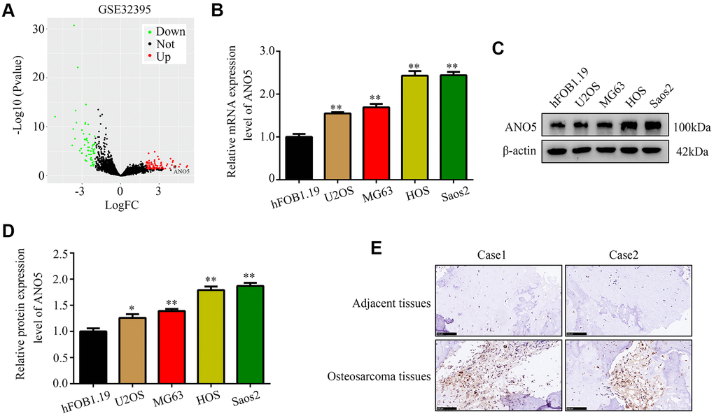 First, we analyzed gene expression in the GSE32395 dataset, which contains the normal osteoblast cell line hFOB 1.19, the normal bone marrow stromal cell line L87/4, and seven osteosarcoma cell lines (HOS, HOS-58, U2OS, Saos2, MNNG, SJSA, and MG63). The results showed that ANO5 gene expression was markedly upregulated in osteosarcoma cell lines (Figure 1A). Using qRT-PCR and western blot, we found that ANO5 mRNA and protein levels were both elevated in osteosarcoma cells (U2OS, MG63, HOS, and Saos2) compared to the normal osteoblast cell line hFOB 1.19 (Figure 1B–1D). Furthermore, immunohistochemical staining of ANO5 in 40 paired osteosarcoma and adjacent normal tissues indicated that ANO5 was also elevated in osteosarcoma tissues (Figure 1E). Finally, we found that high ANO5 expression was positively associated with tumor size, tumor grade, and metastasis (Table 1). Together, these results indicate that ANO5 may act as an oncogene in osteosarcoma.