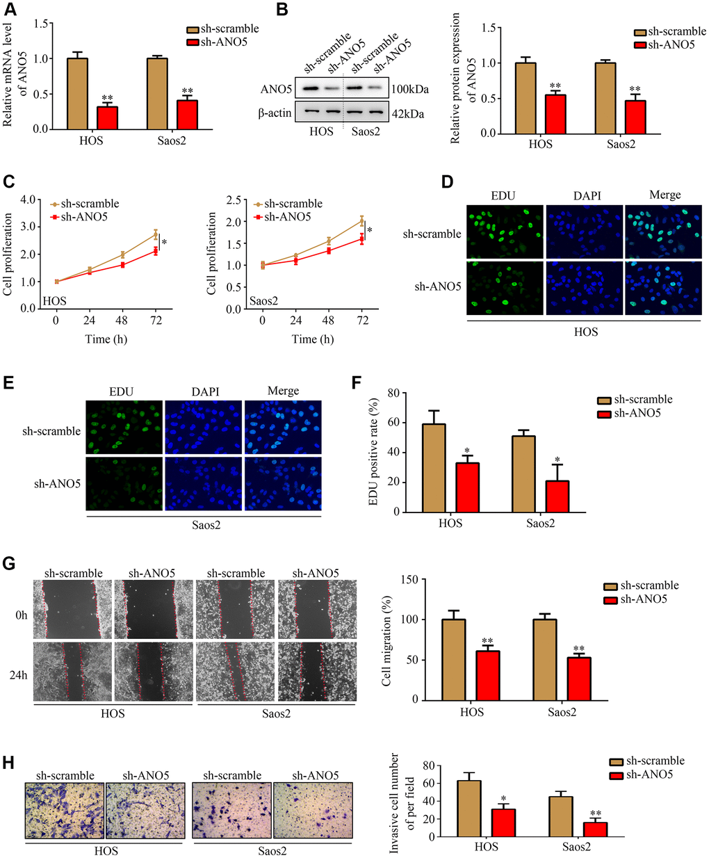 To examine the role of ANO5 in osteosarcoma, short hairpin RNAs were used to established ANO5 knockdown cells (Figure 2A, 2B). CCK-8 and EDU assays showed that inhibition of ANO5 decreased HOS and Saos2 cell proliferation (Figure 2C–2F). A wound healing assay showed that inhibition of ANO5 significantly suppressed the migration of HOS and Saos2 cells (Figure 2G). Moreover, a transwell assay indicated that suppression of ANO5 decreased HOS and Saos2 cell invasion (Figure 2H).