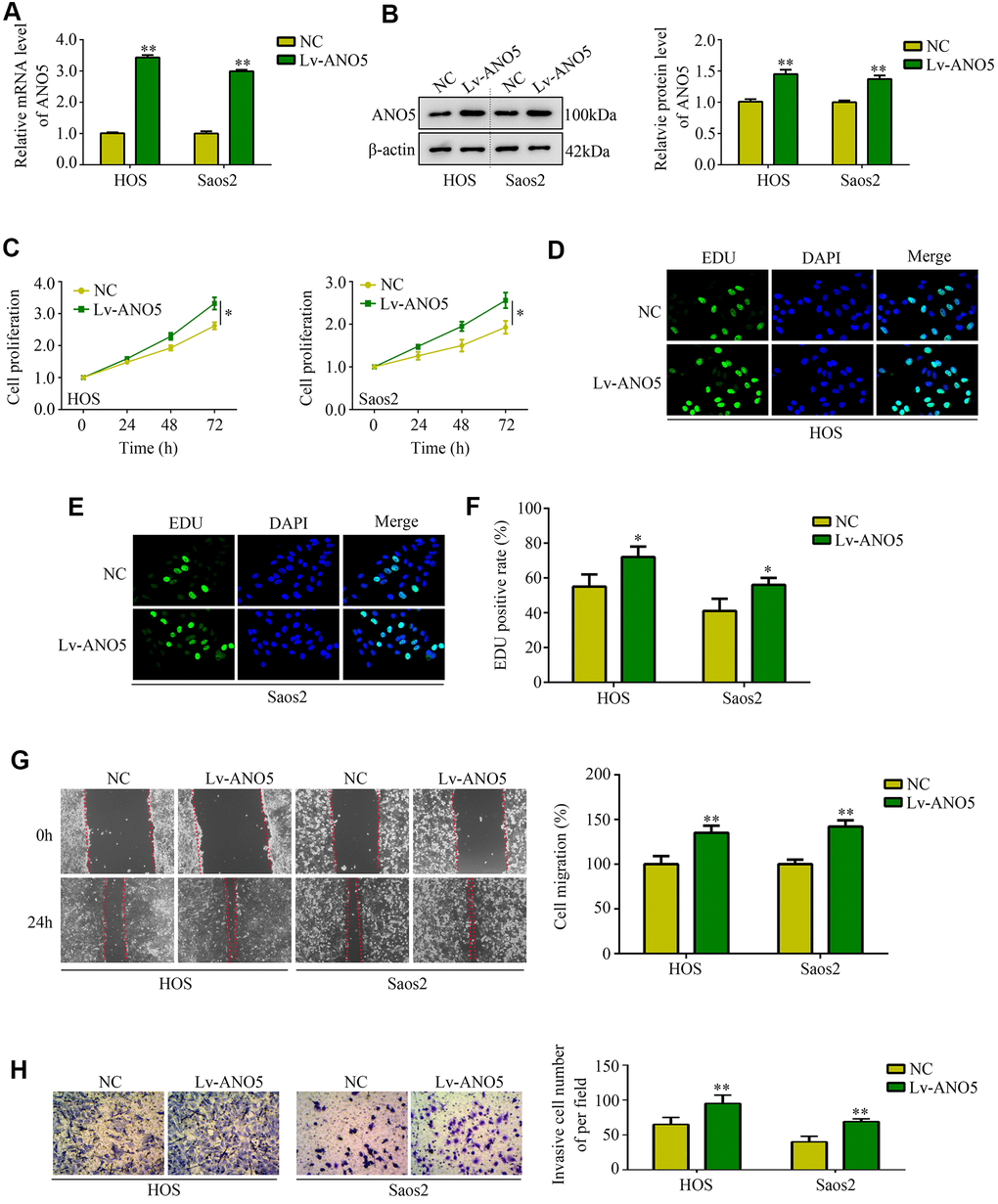 Next, we used an ANO5 overexpression lentivirus to generate ANO5 overexpression cell lines (Figure 3A, 3B). CCK-8 and EDU assays indicated that ANO5 overexpression increased the proliferation rate of HOS and Saos2 cells (Figure 3C–3F). Similarly, wound healing assays demonstrated that overexpression of ANO5 promoted migration in HOS and Saos2 cells (Figure 3G). Furthermore, increased ANO5 expression promoted invasion in HOS and Saos2 cells (Figure 3H). Taken together, these in vitro experiments indicated that ANO5 acts as oncogene by promoting osteosarcoma cell proliferation and metastasis.